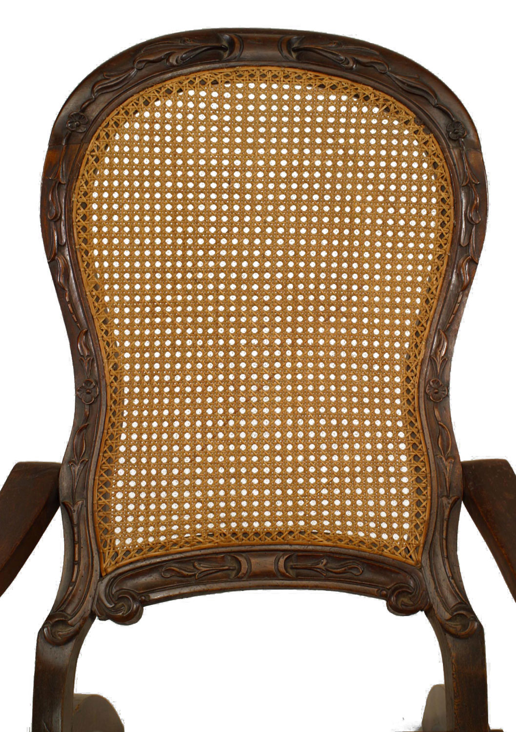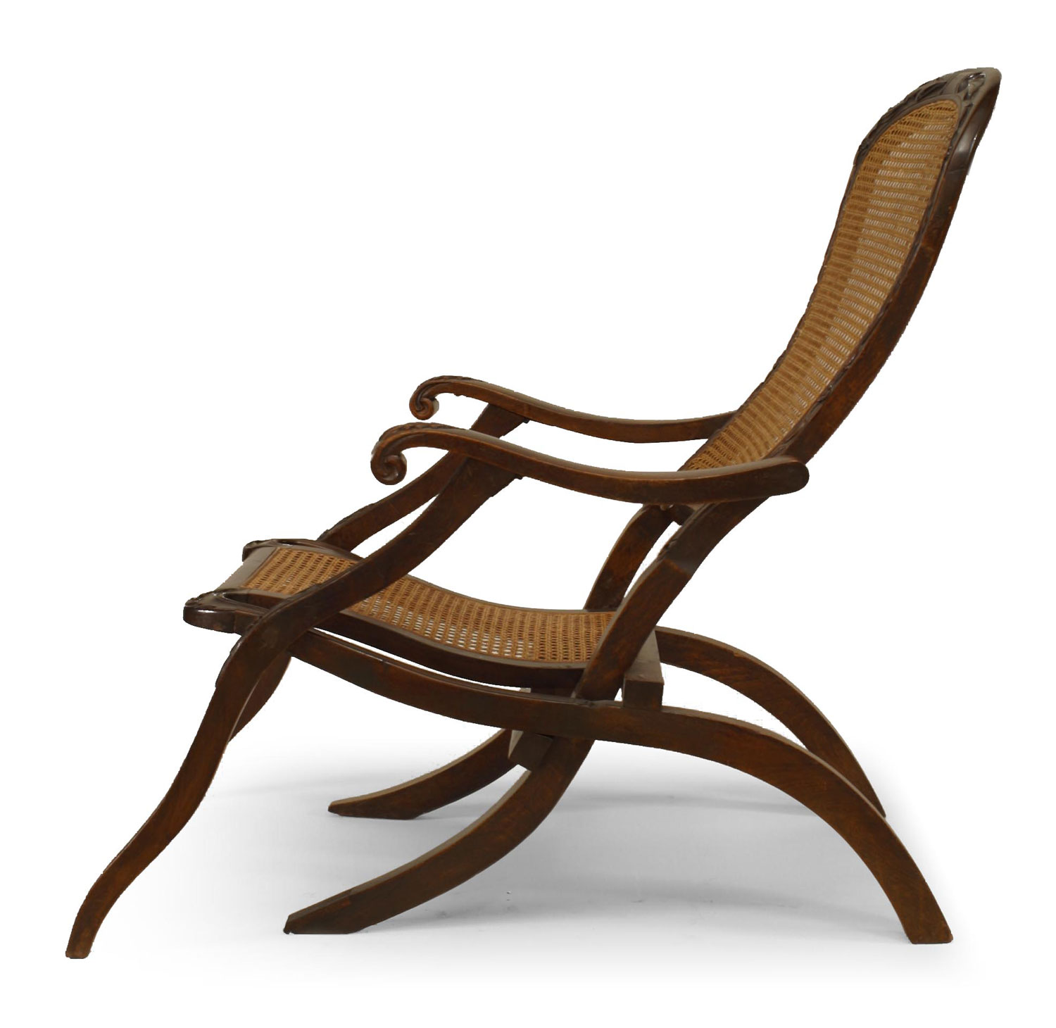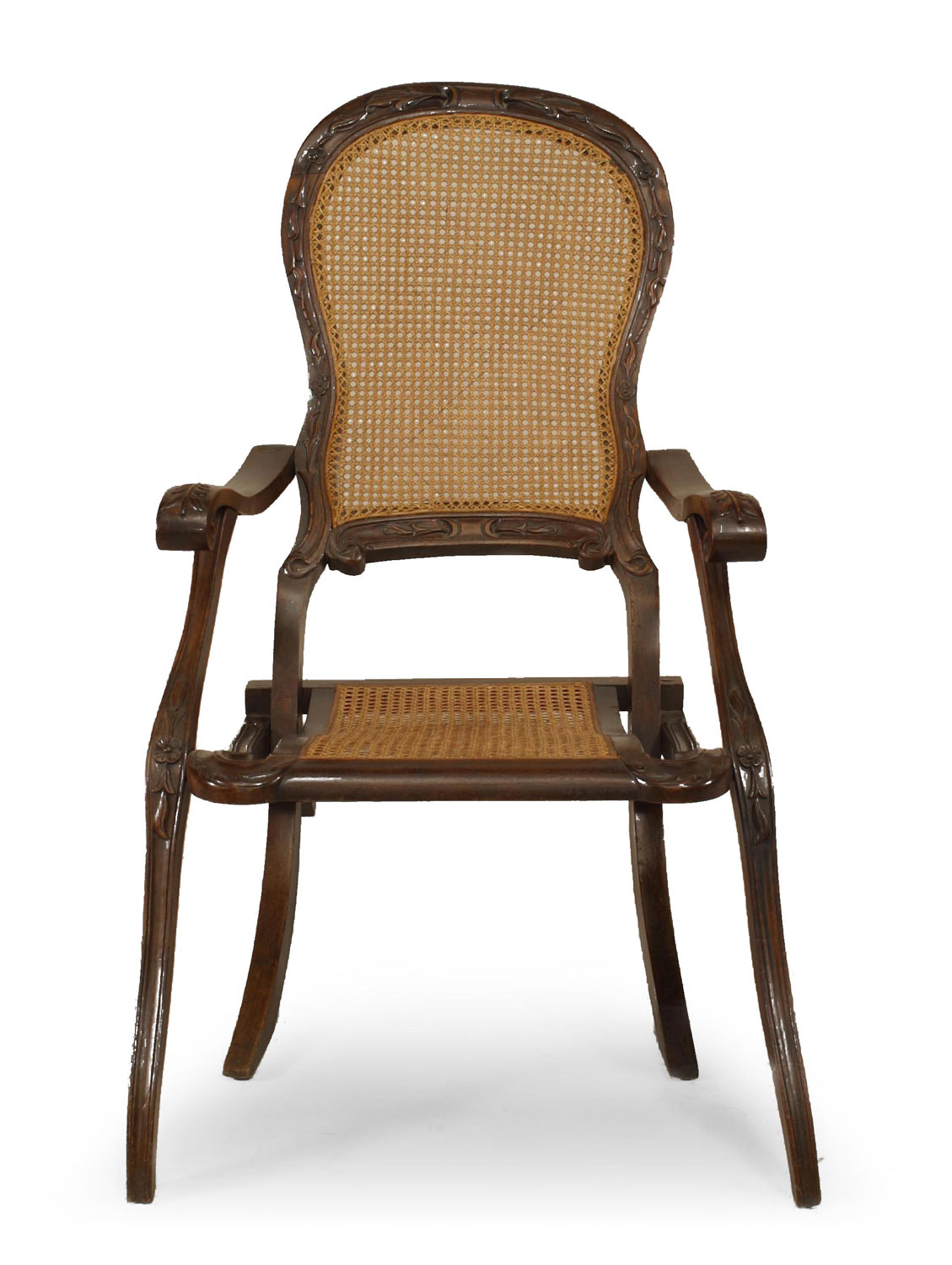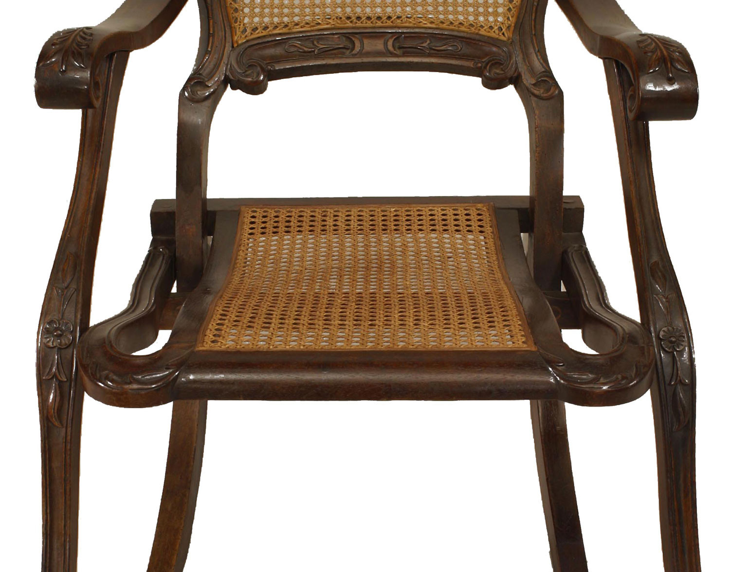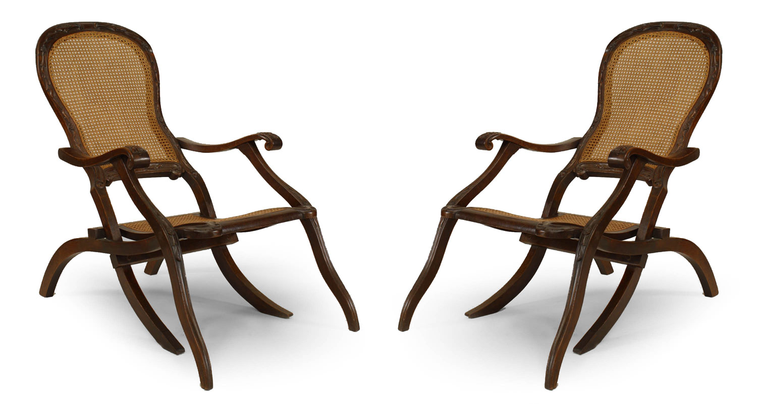 PAIR of English Anglo-Indian walnut folding campaign Armchairs with cane panel seat and back and carved floral trim on back frame