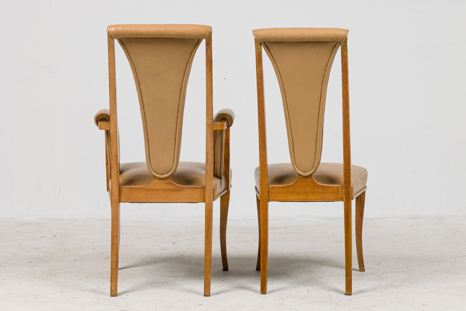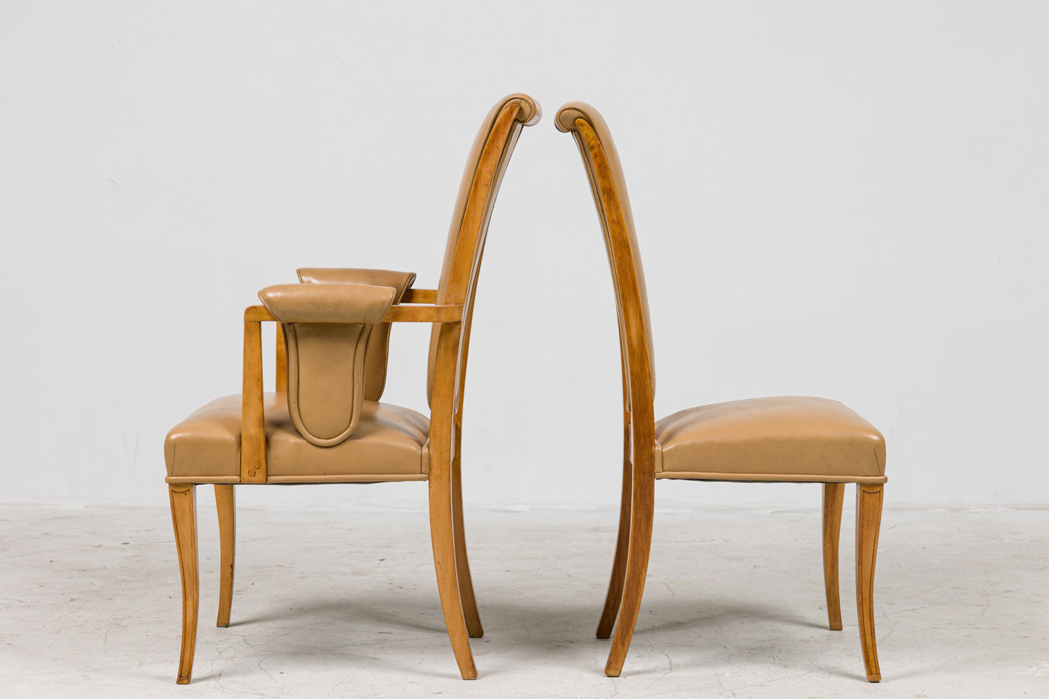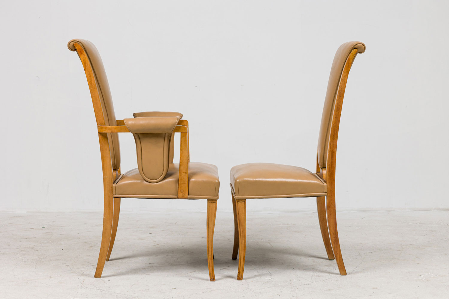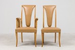 SET of 8 English Art Deco maple high back dining chairs with beige leather upholstery (2 arms:22½"w x 26"d x 42"h/6 side) (S. Hille & Co., c.1948).