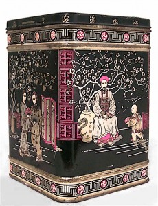 English (20th Century) small black painted tole tea canister with chinoiserie decoration.