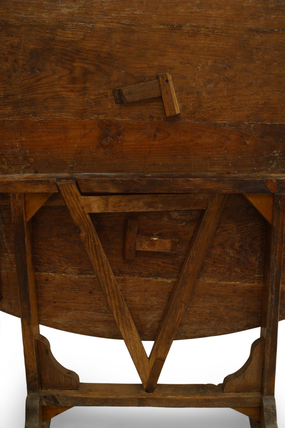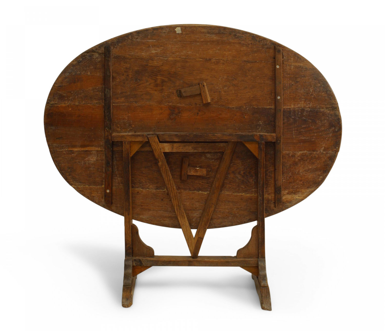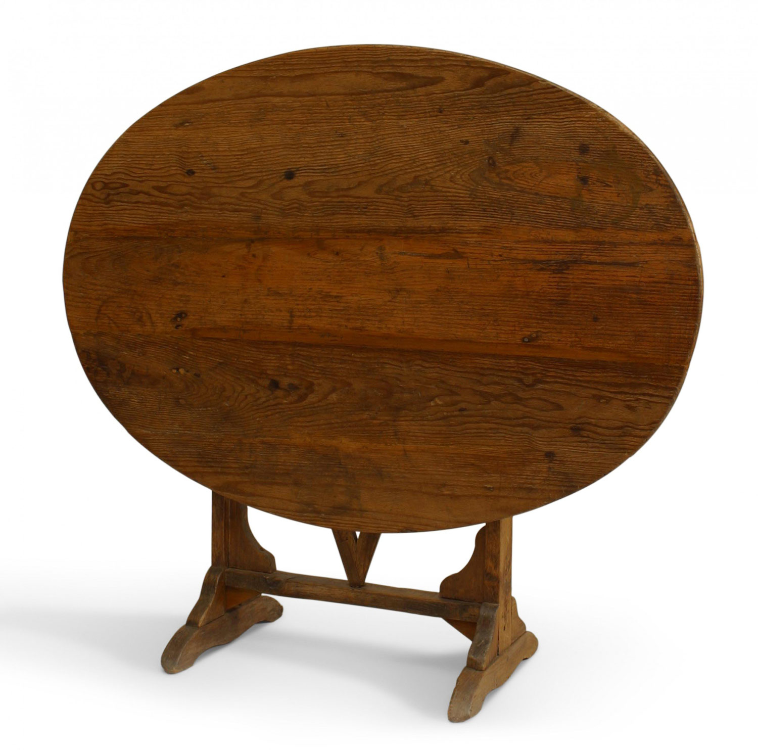 English Country-style (19th Century) oval pine tilt top end table with trestle base..