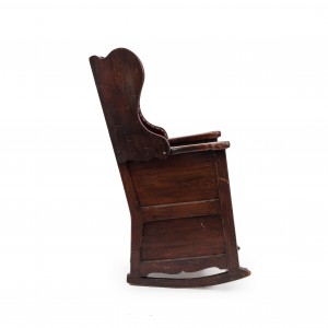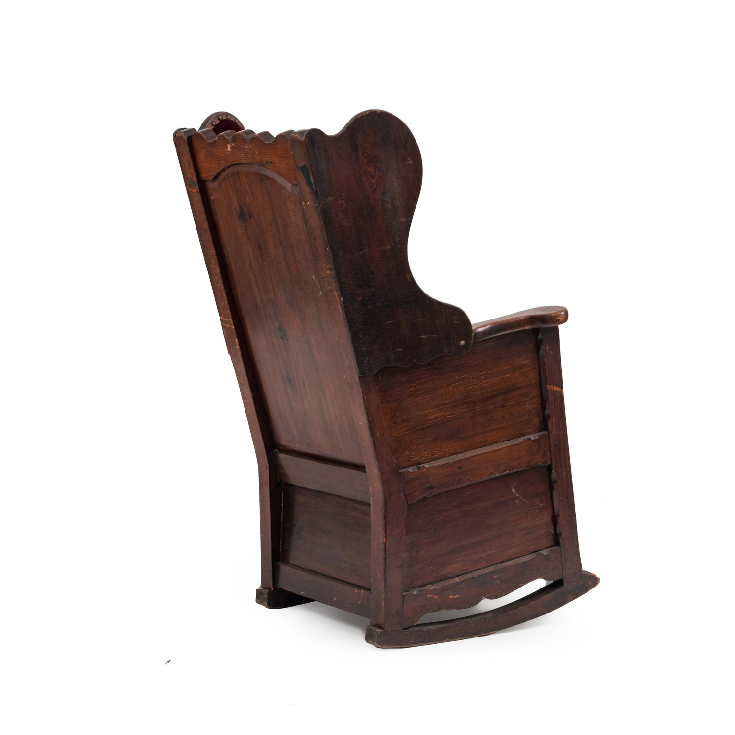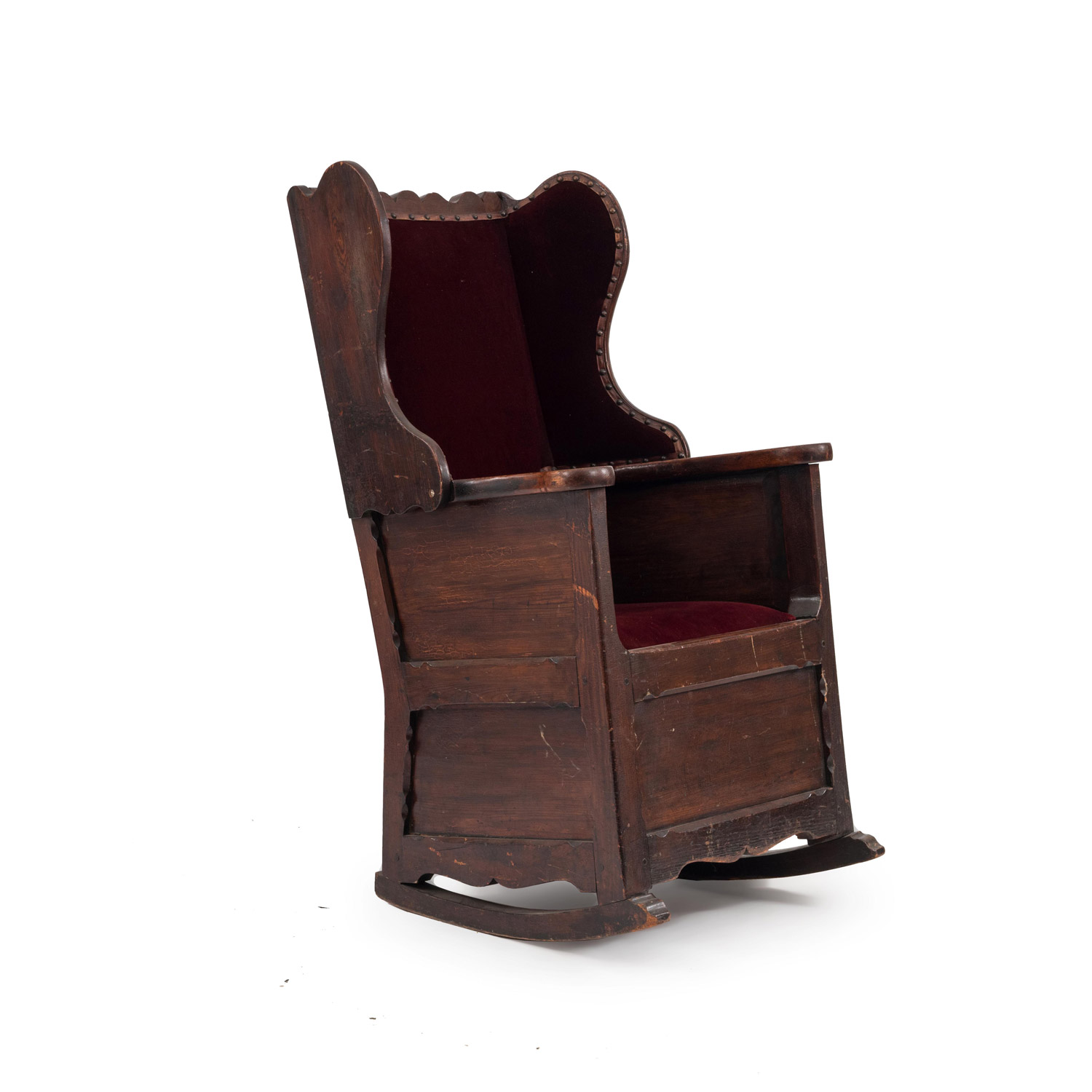 English Country (18/19th Cent) antique winged back pine rocking chair with scalloped back and red velvet upholstered seat & back.
