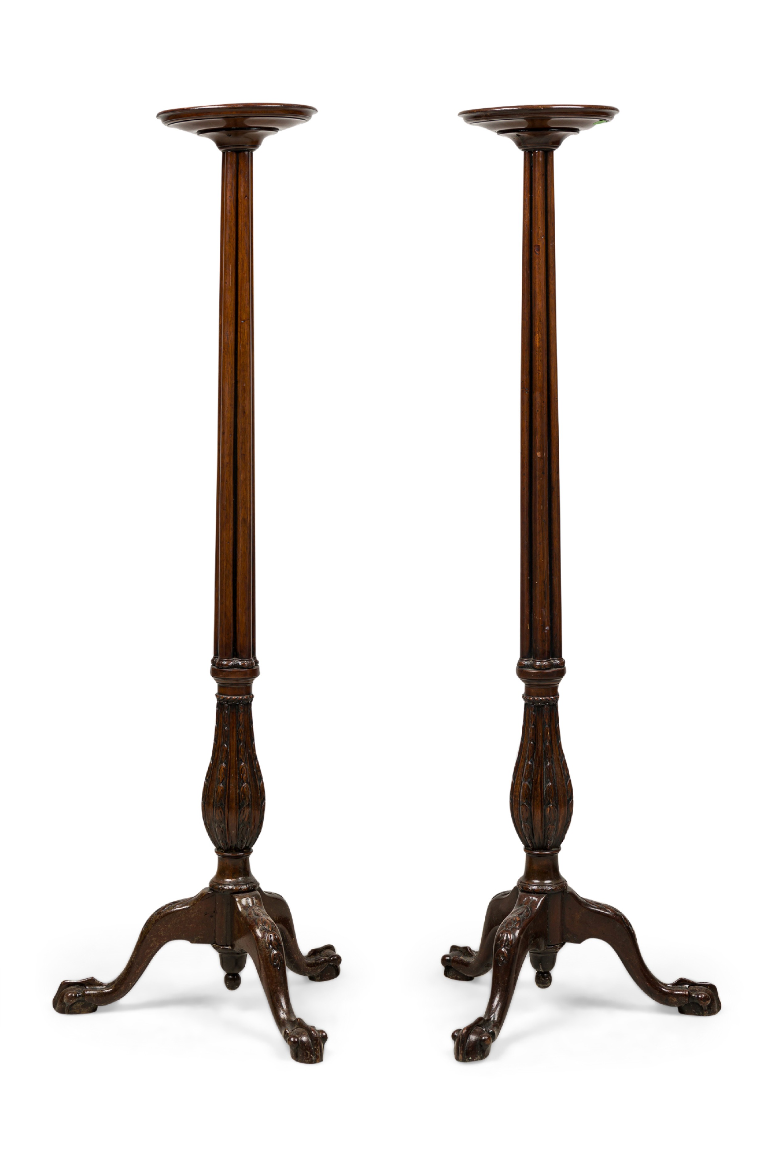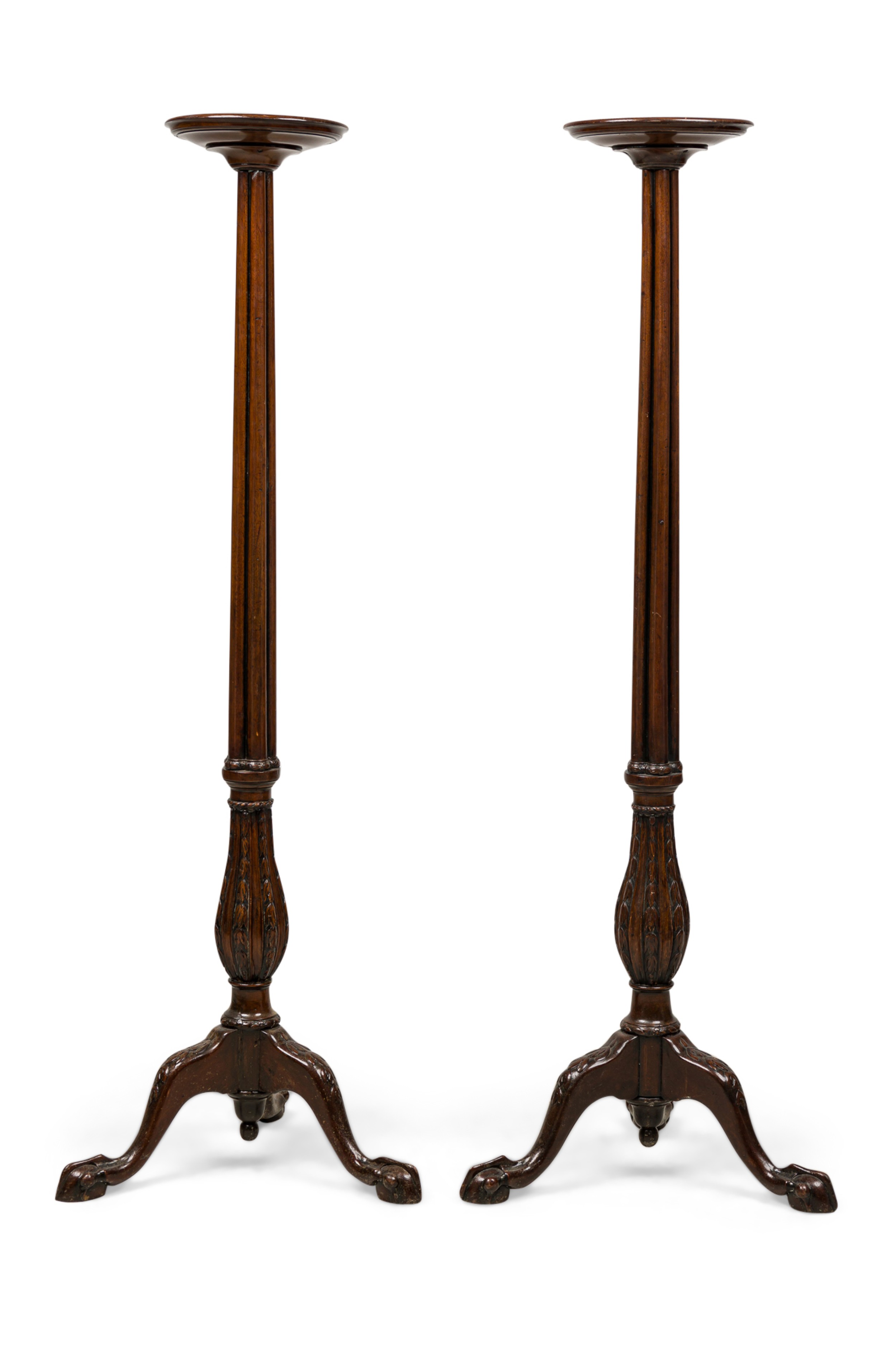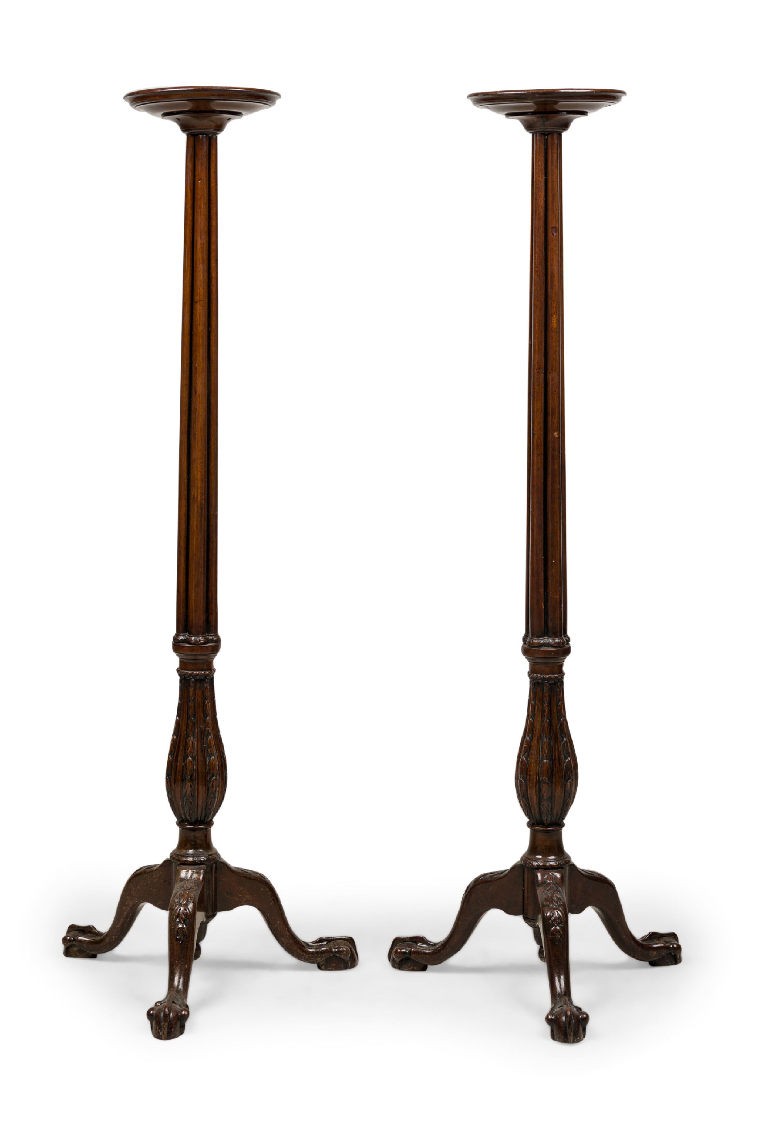 PAIR of English Georgian ChippendaIe style (19/20thCentury) mahogany pedestals with five cluster column over a carved balustered lower section supported on three carved ball and claw feet (PRICED AS PAIR).