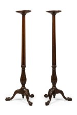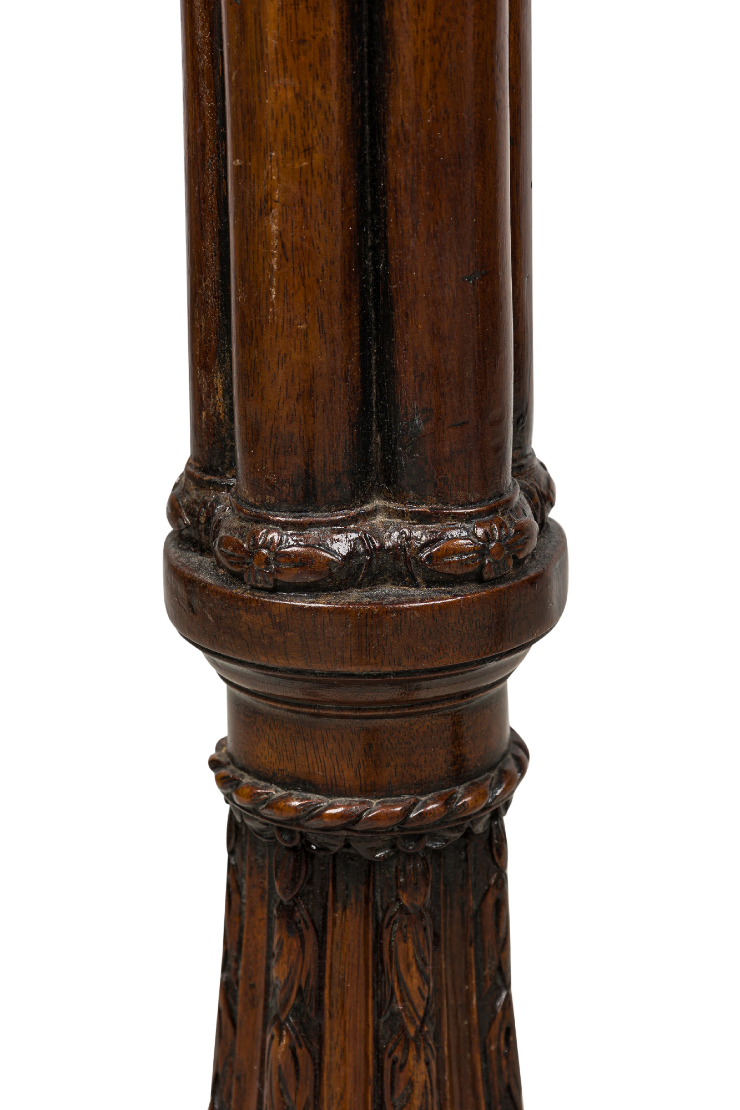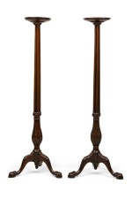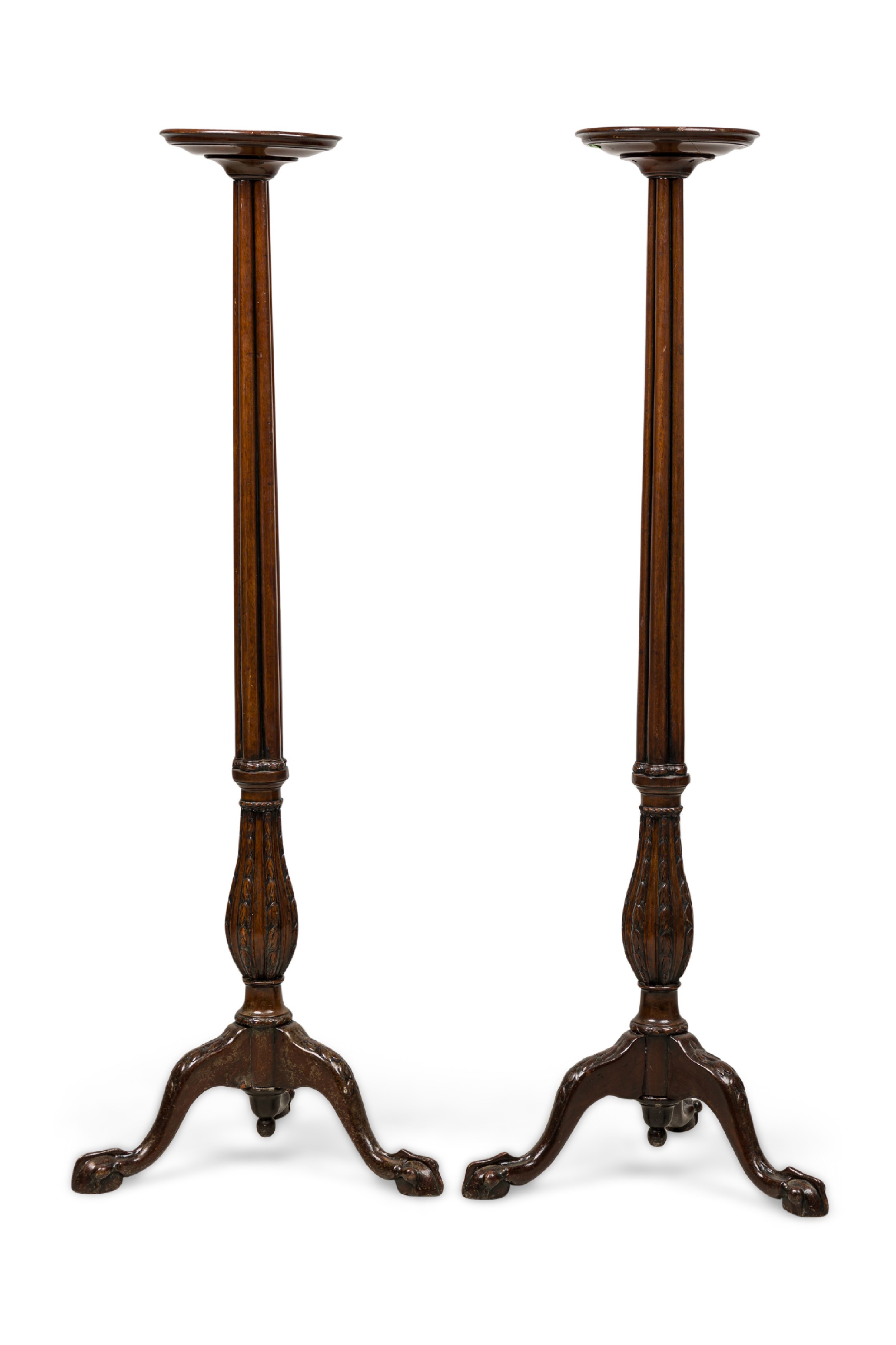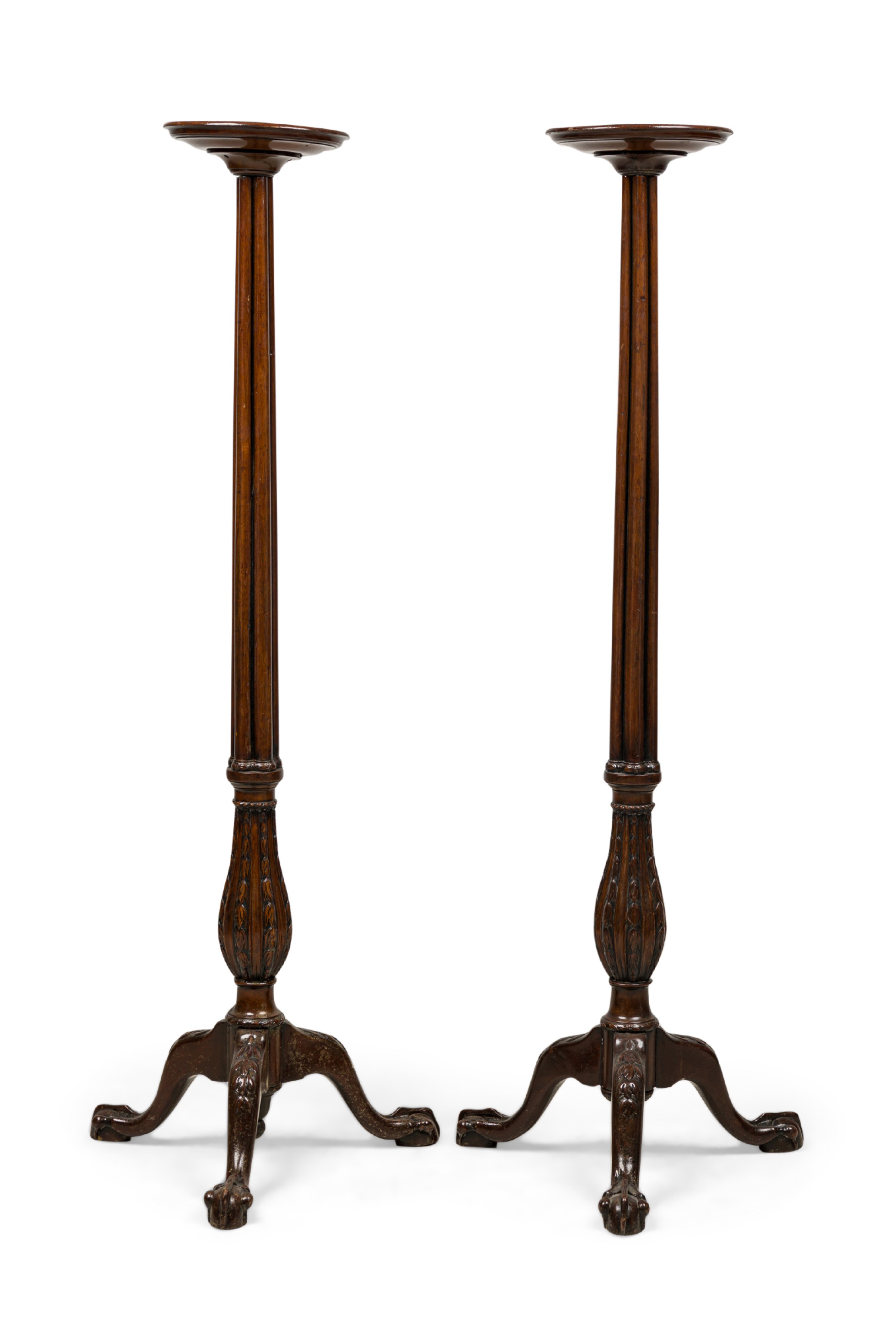 PAIR of English Georgian ChippendaIe style (19/20thCentury) mahogany pedestals with five cluster column over a carved balustered lower section supported on three carved ball and claw feet (PRICED AS PAIR).