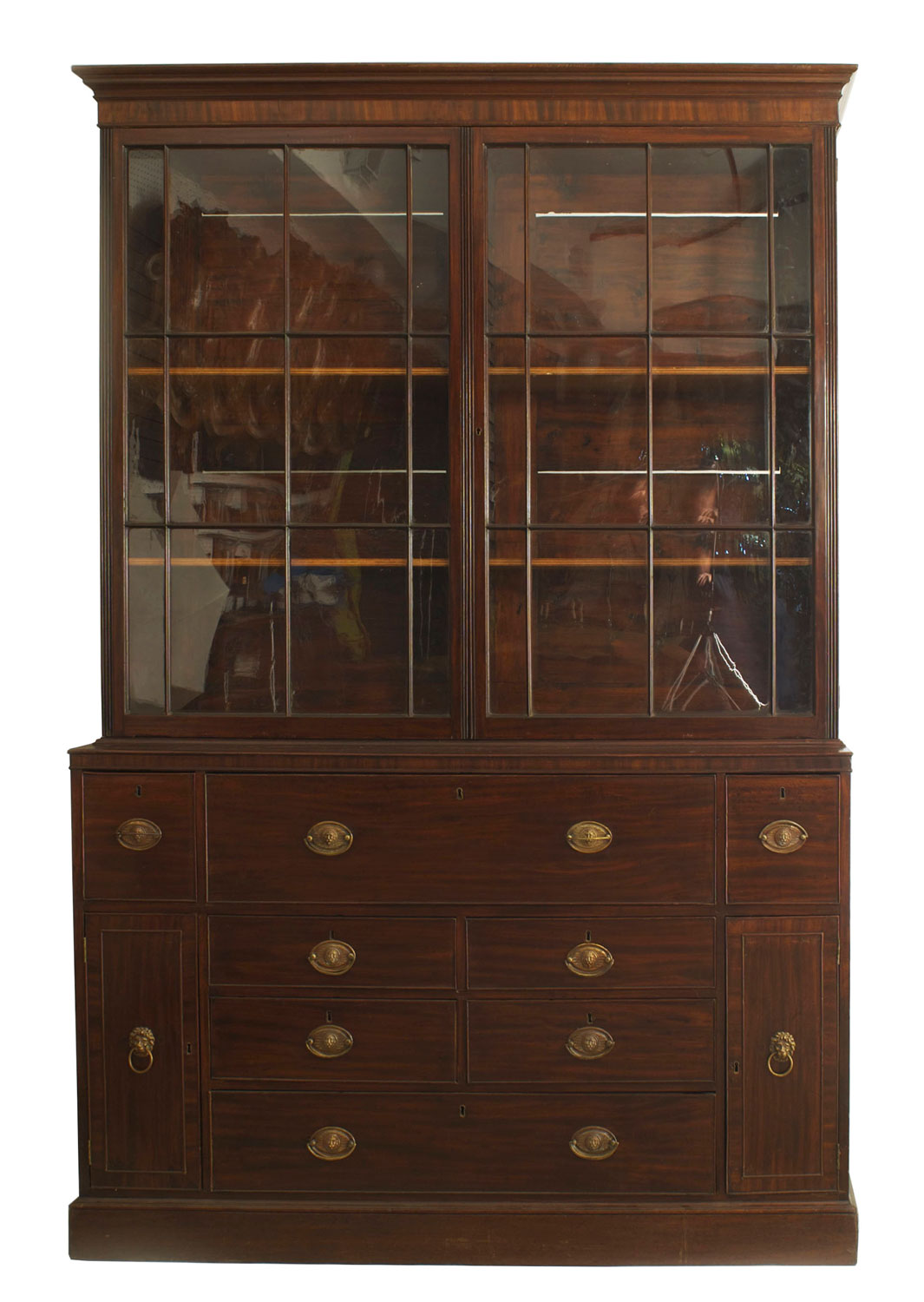 English Georgian (18/19th Century) mahogany secretary bookcase having a 2 glass mullioned doors over multiple drawers & a fall-front center with brass handles..