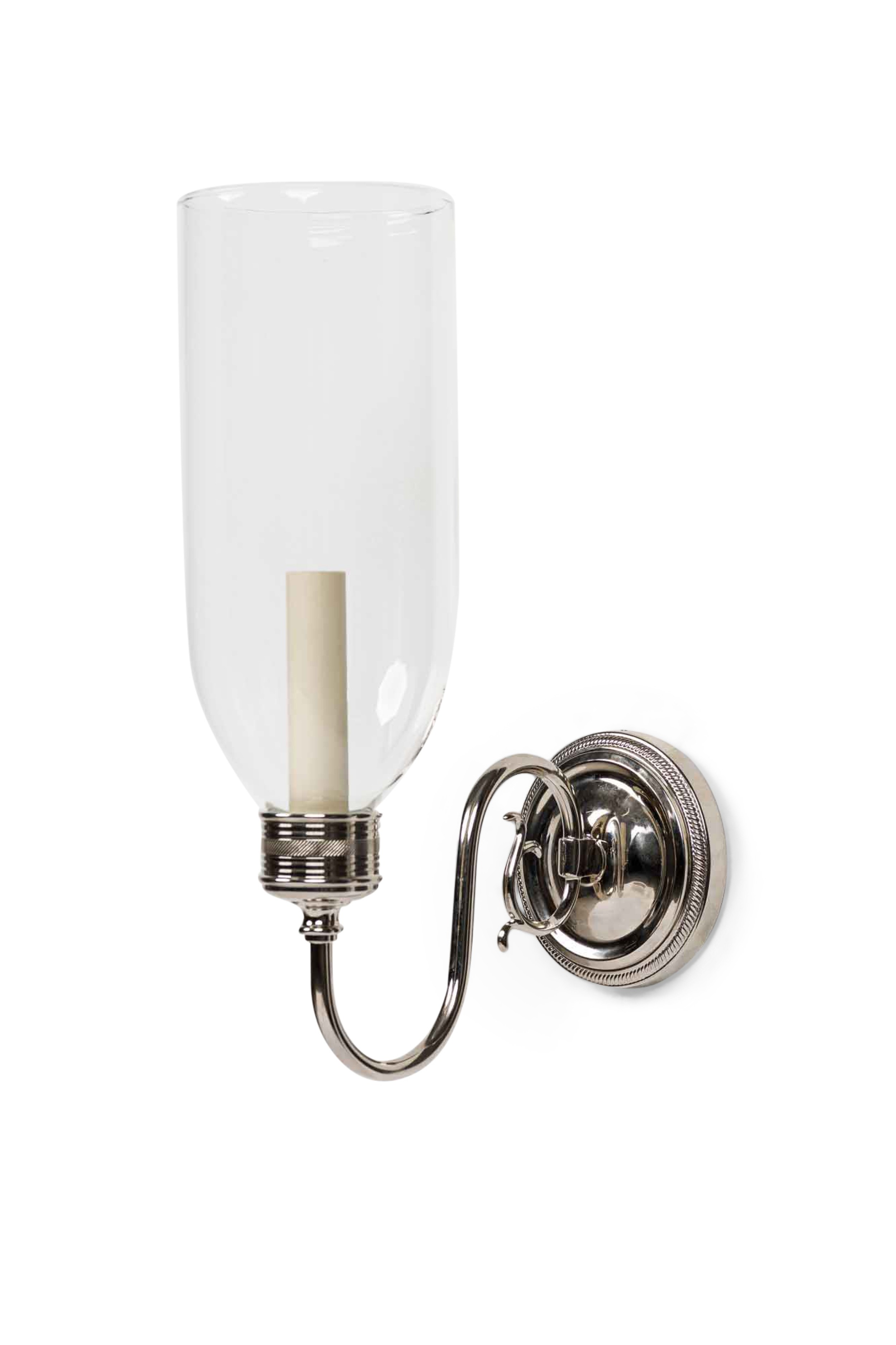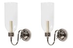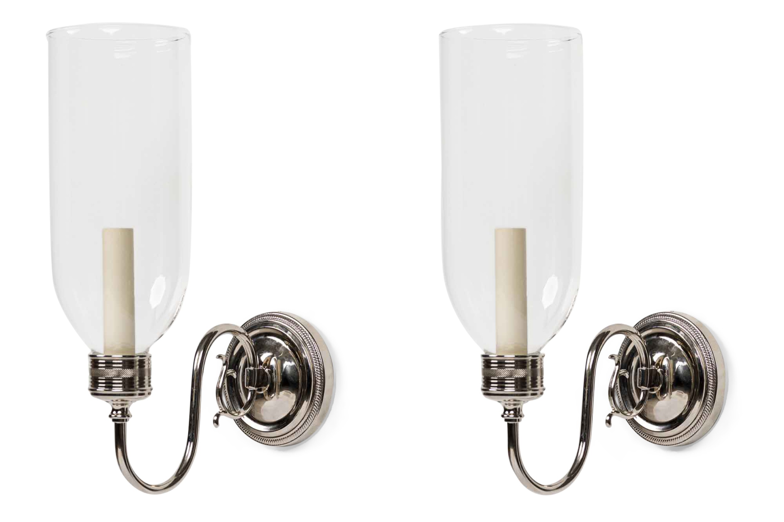 PAIR of English Georgian style (20th Century) goose neck hurricane sconces bearing a twisted barley detail on nickel plated backplate (marked: VAUGHAN) (PRICED AS PAIR).
