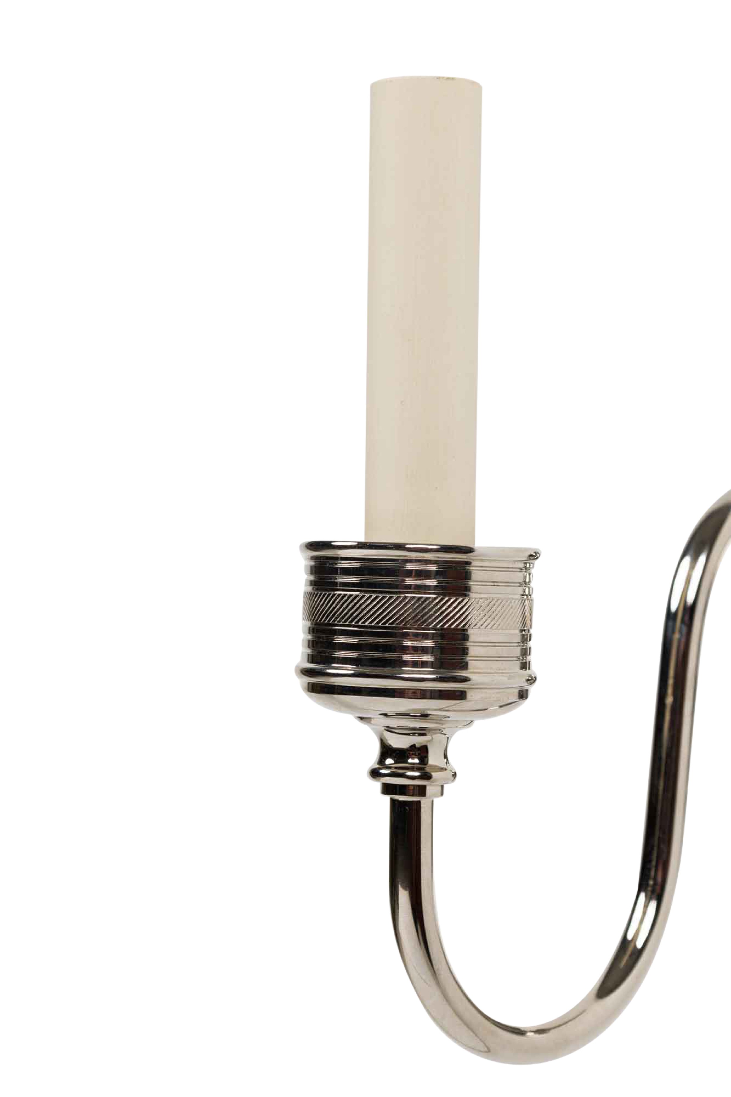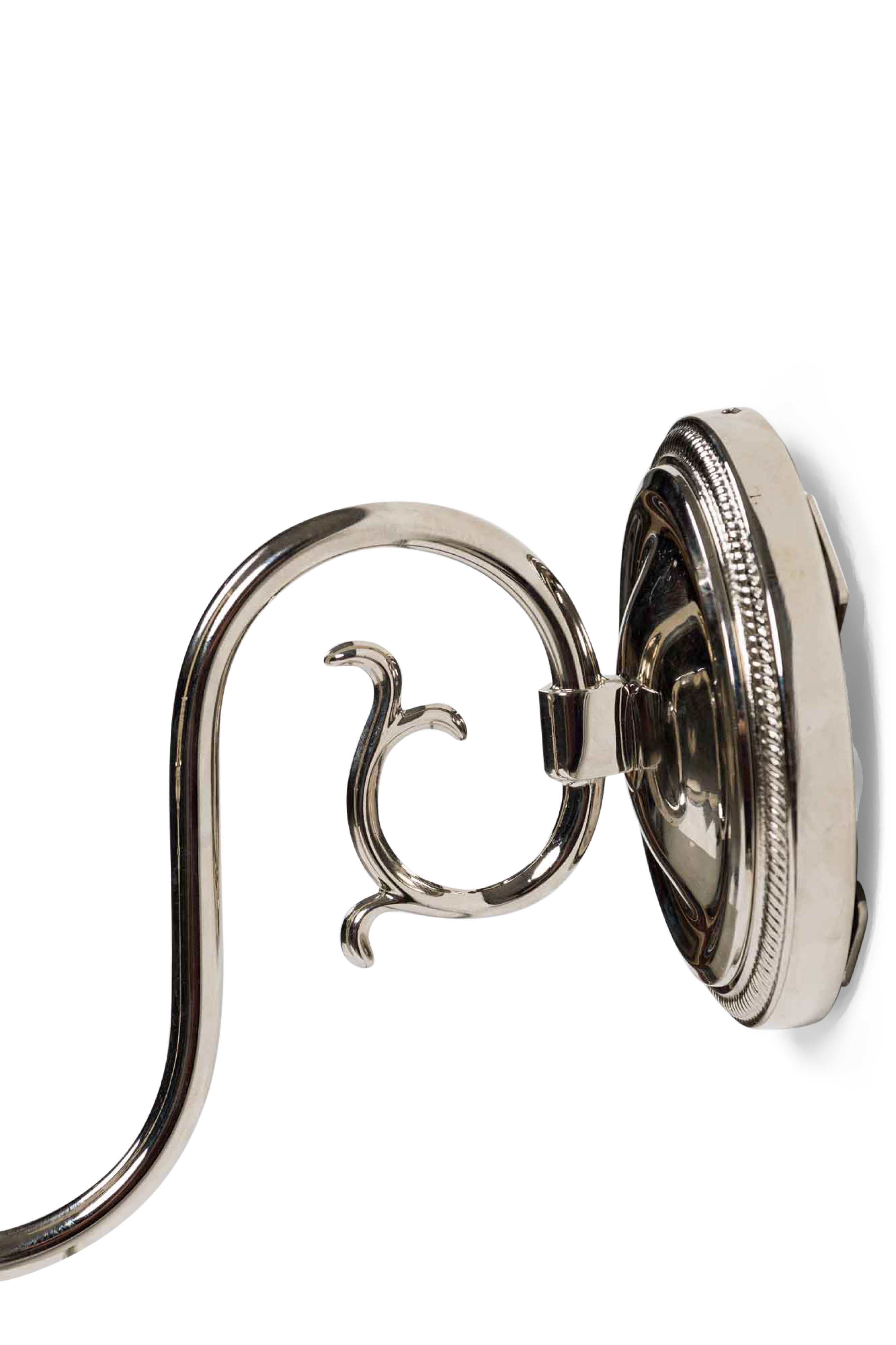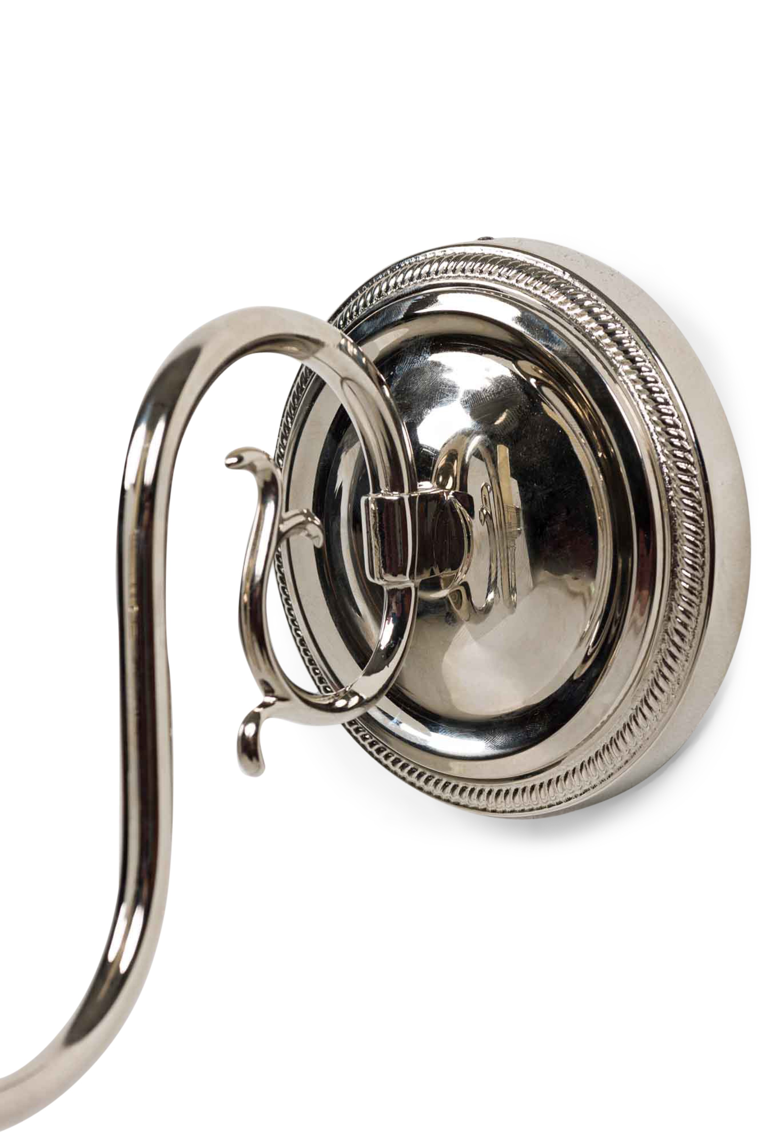 PAIR of English Georgian style (20th Century) goose neck hurricane sconces bearing a twisted barley detail on nickel plated backplate (marked: VAUGHAN) (PRICED AS PAIR)