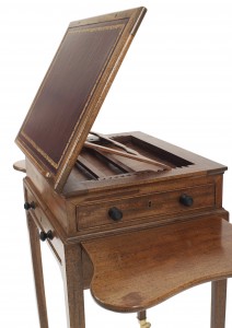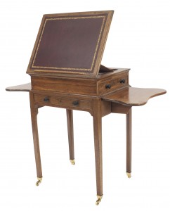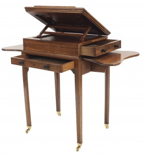 English Georgian-style (19th Century) walnut end table / desk with drop sides (10" wide) and having a front and side drawer with adjustable leather inset lift top on brass castors