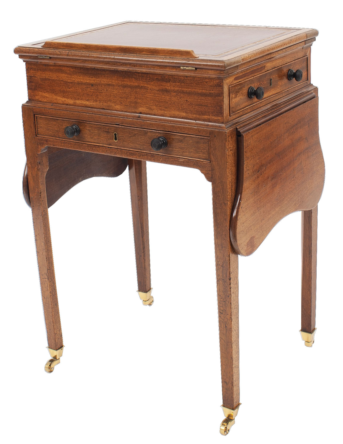 English Georgian-style (19th Century) walnut end table / desk with drop sides (10" wide) and having a front and side drawer with adjustable leather inset lift top on brass castors.