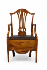 English Hepplewhite (18th Century) elm wood commode chair with slightly curved urn-form openwork back splat, shaped arms and flattened apron surrounding a black leather seat, concealing a lower opening for a chamber pot.
