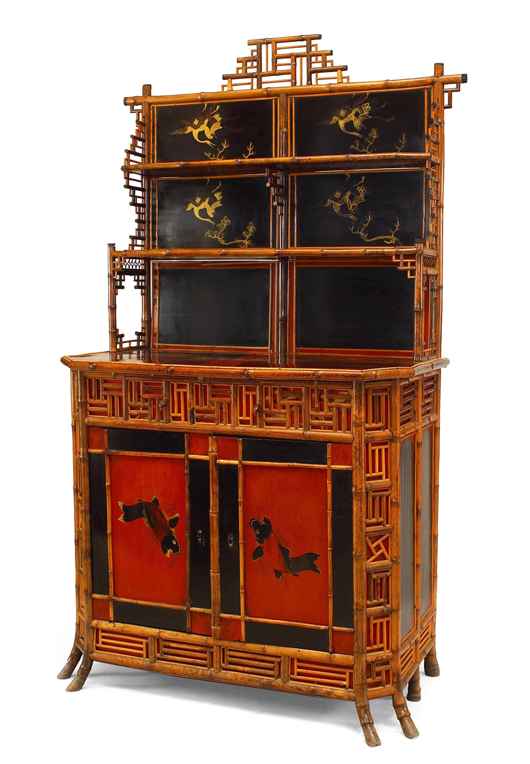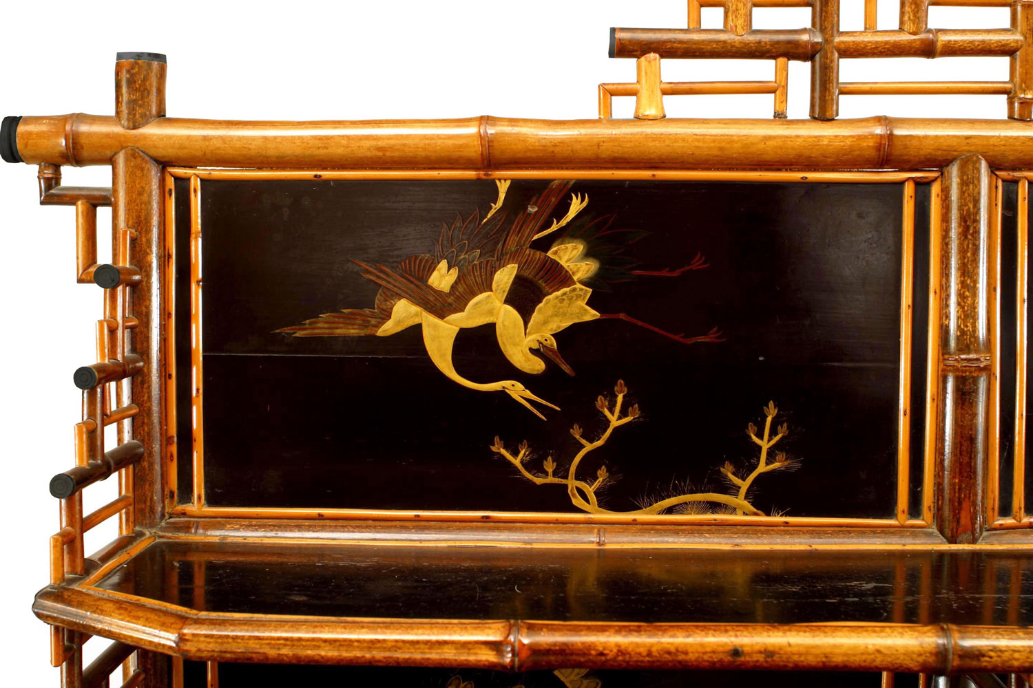 English Regency-style (19th Century) bamboo and lacquered etagere cabinet with inlaid panels on 2 front doors and drawer and detailing