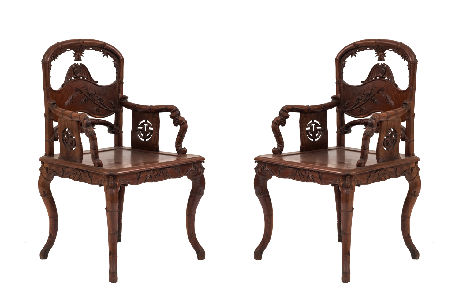 PAIR of English Regency-style (19/20th Century) rosewood faux bamboo carved armchairs with open and filigree-carved backs (PRICED AS PAIR) (Matching loveseat: 012350)