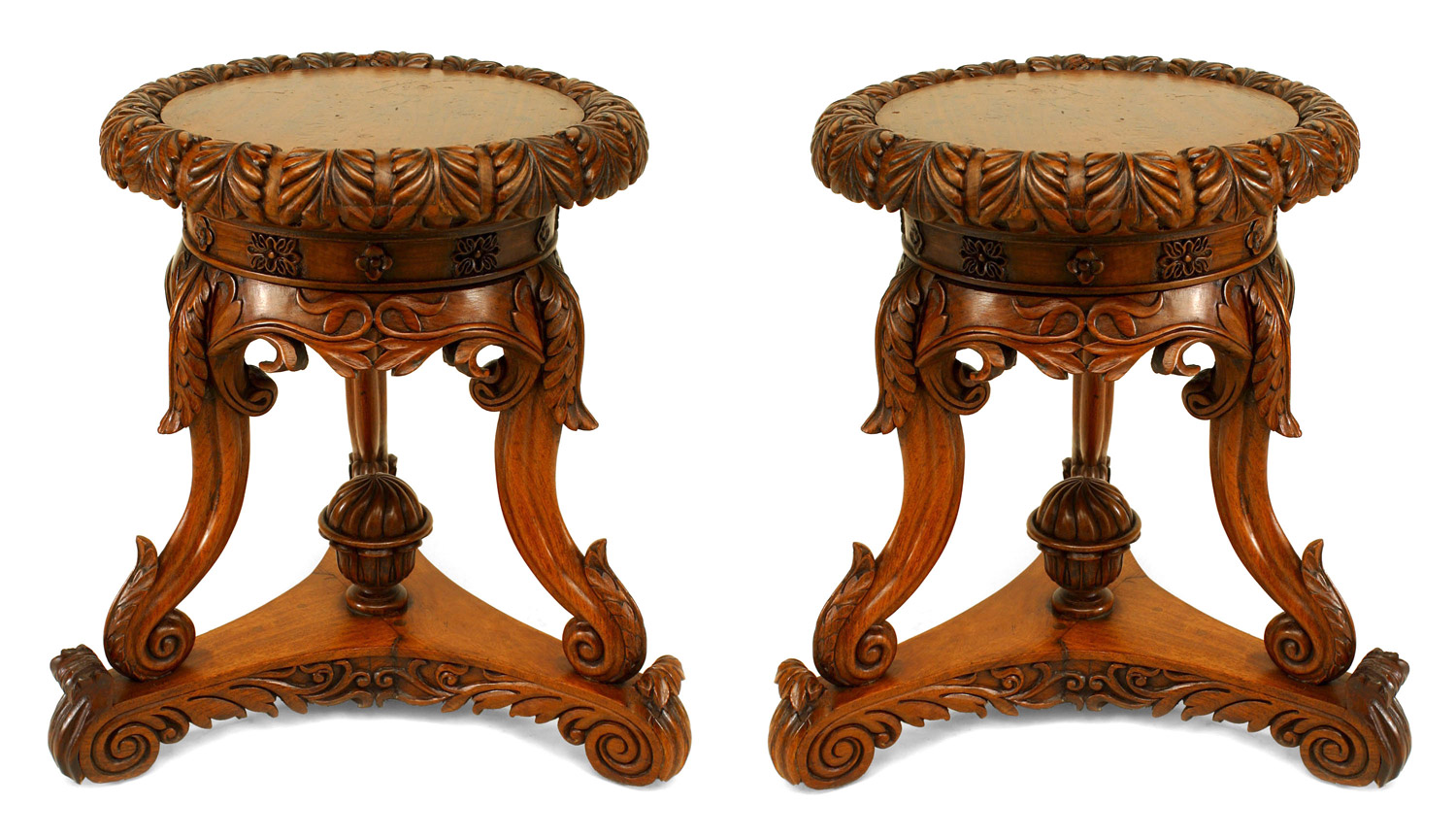 PAIR of English Regency (Anglo Indian) rosewood taborets with leaf carved top border and finial on base (similar pair in the Brighton Royal Pavilion.) (PRICED AS PAIR)