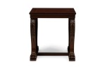 English Regency style (20th Century) side table featuring rosewood veneered top with mahogany border, ending on trestle legs carved with scallop or foliate designs (marked: STANFORD)