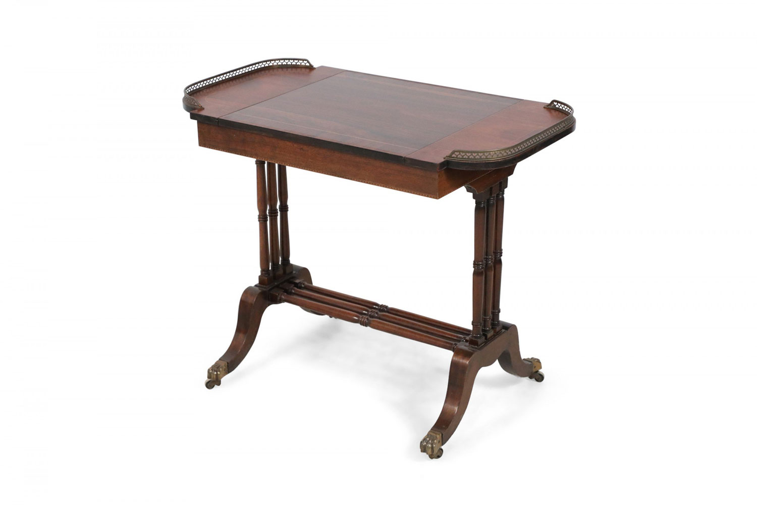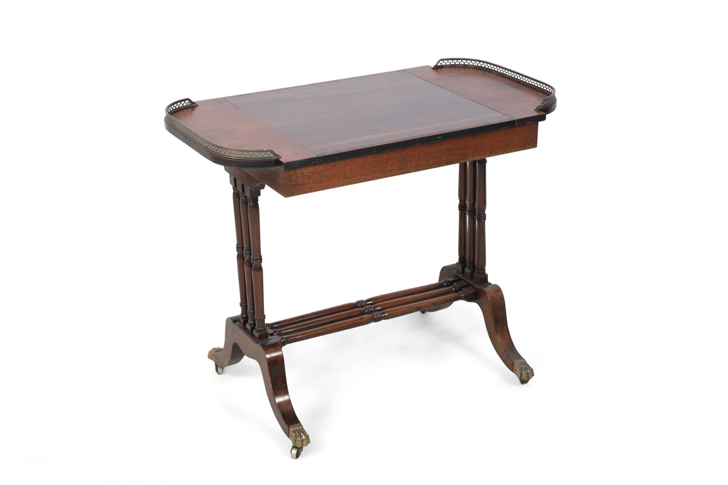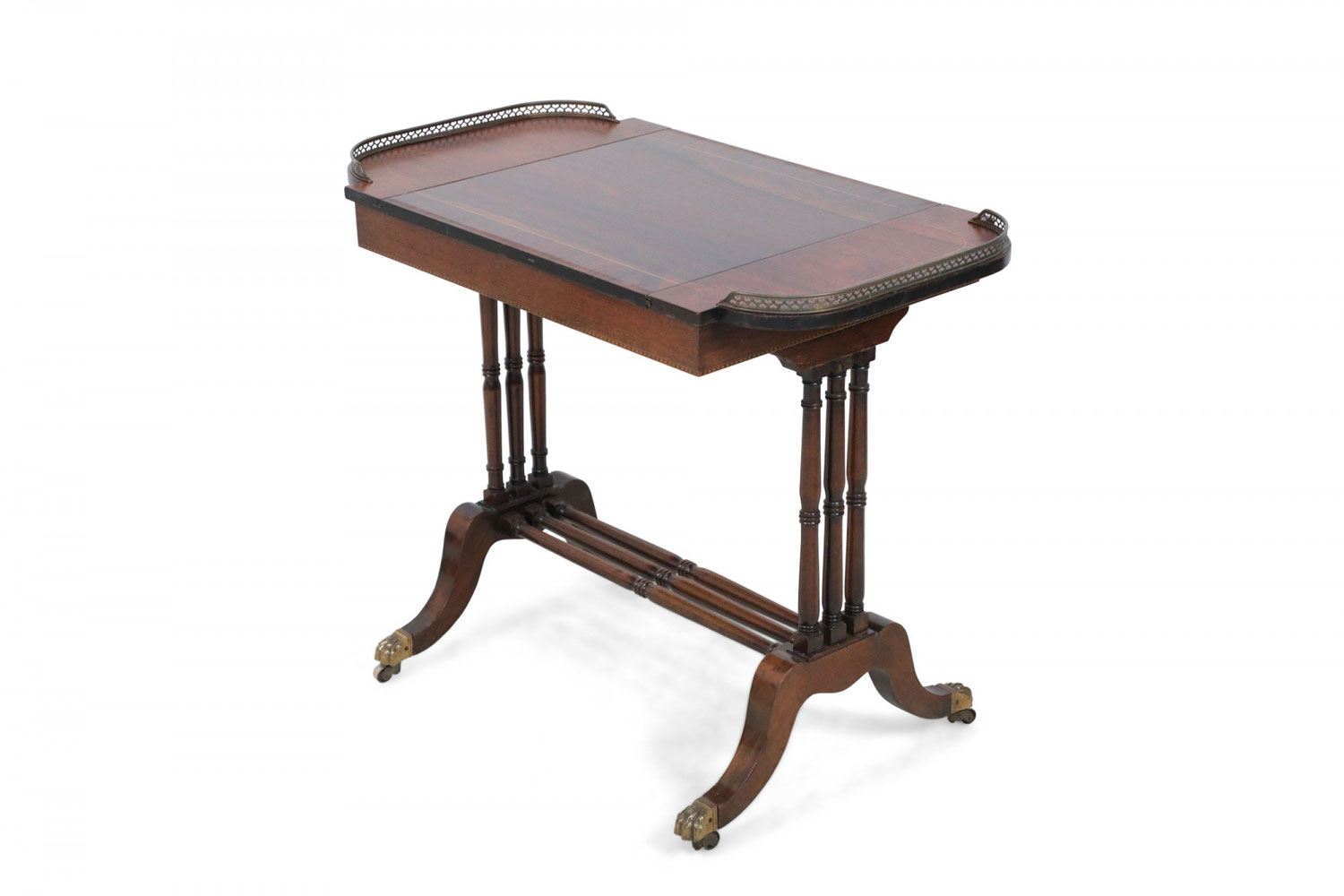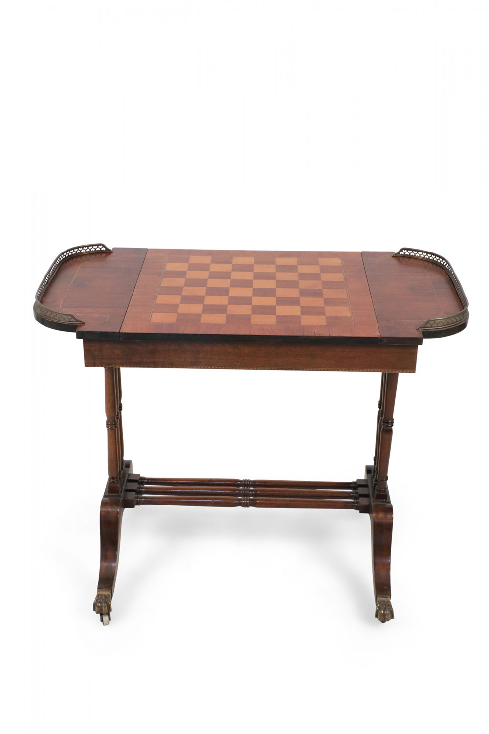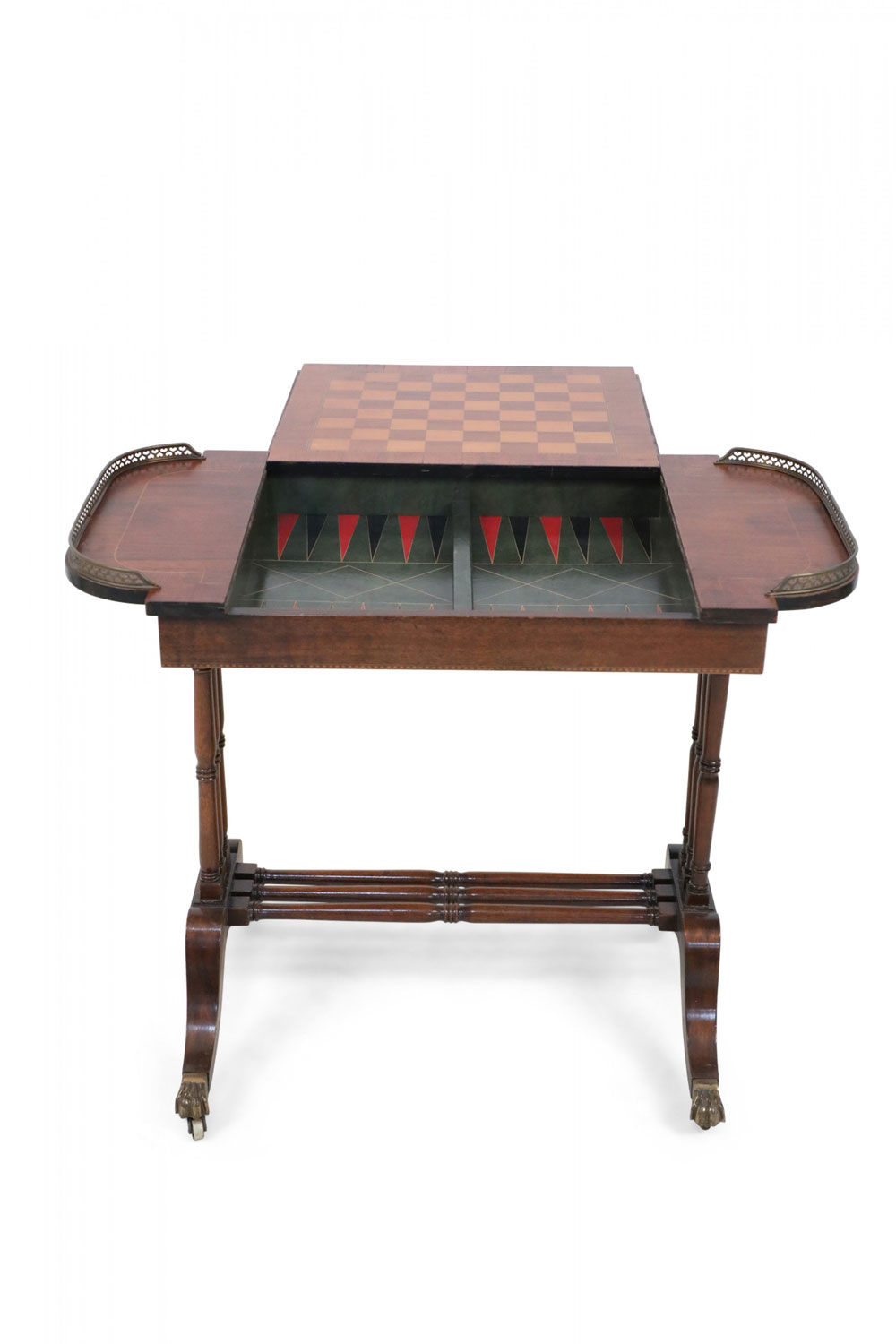 English Regency-style (19th Century) mahogany game table with metal heart detailed gallery surrounding a central top panel that slides out and flips to reveal a chess/checkerboard on the underside and a leather backgammon table in the recessed interior sitting atop a stretcher and lion paw bronze feet with casters.