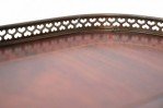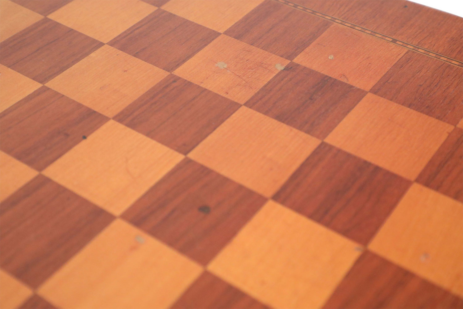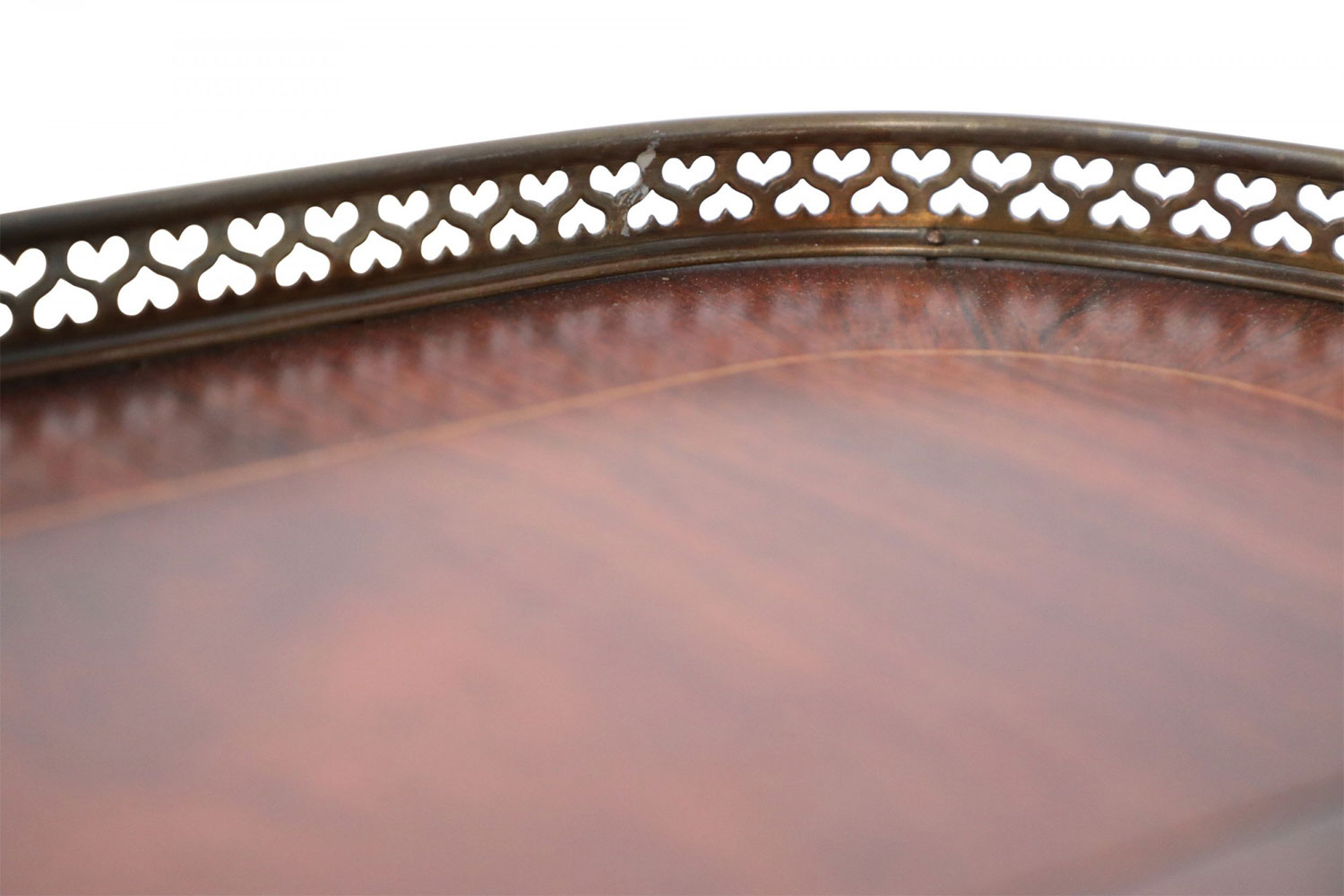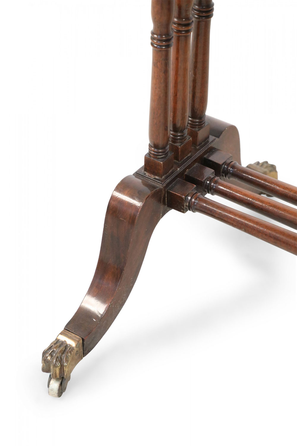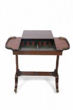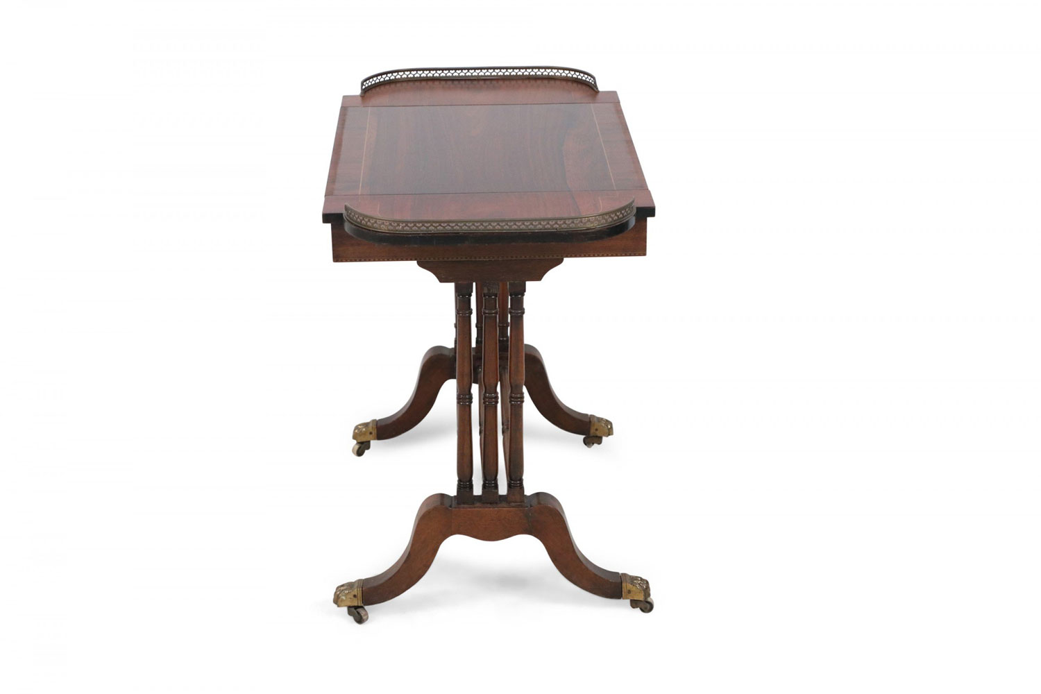 English Regency-style (19th Century) mahogany game table with metal heart detailed gallery surrounding a central top panel that slides out and flips to reveal a chess/checkerboard on the underside and a leather backgammon table in the recessed interior sitting atop a stretcher and lion paw bronze feet with casters.