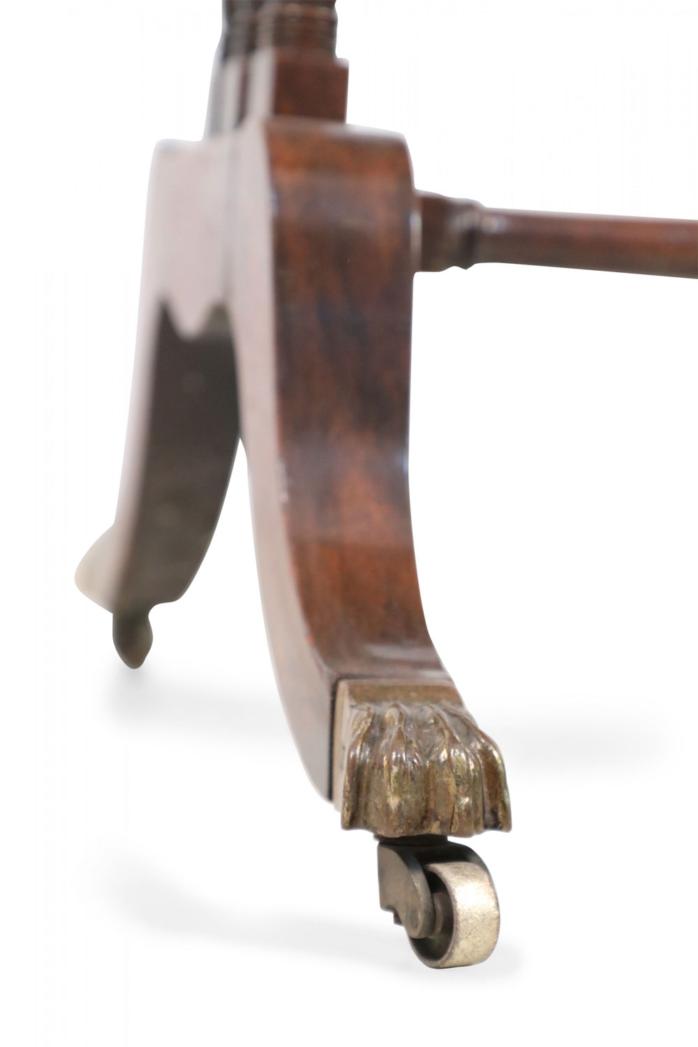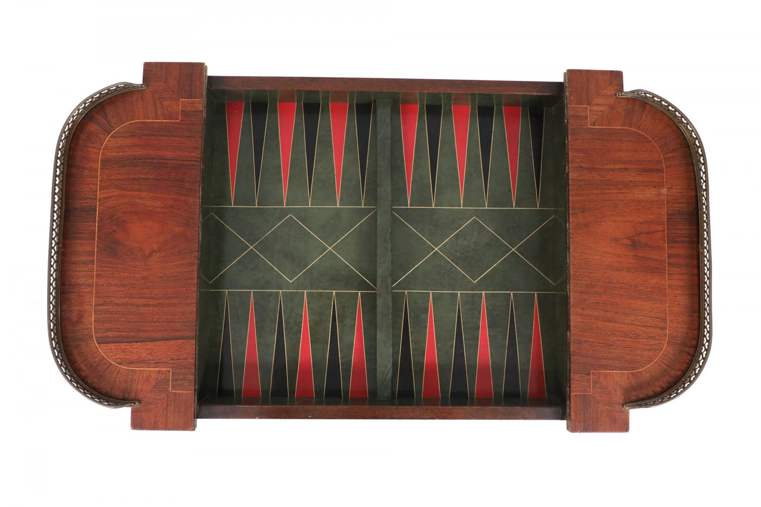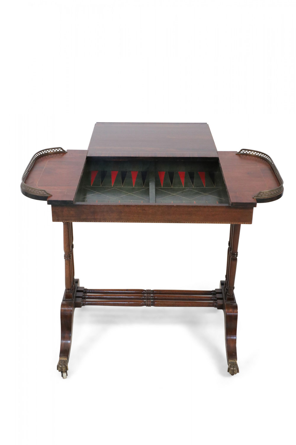 English Regency-style (19th Century) mahogany game table with metal heart detailed gallery surrounding a central top panel that slides out and flips to reveal a chess/checkerboard on the underside and a leather backgammon table in the recessed interior sitting atop a stretcher and lion paw bronze feet with casters..