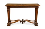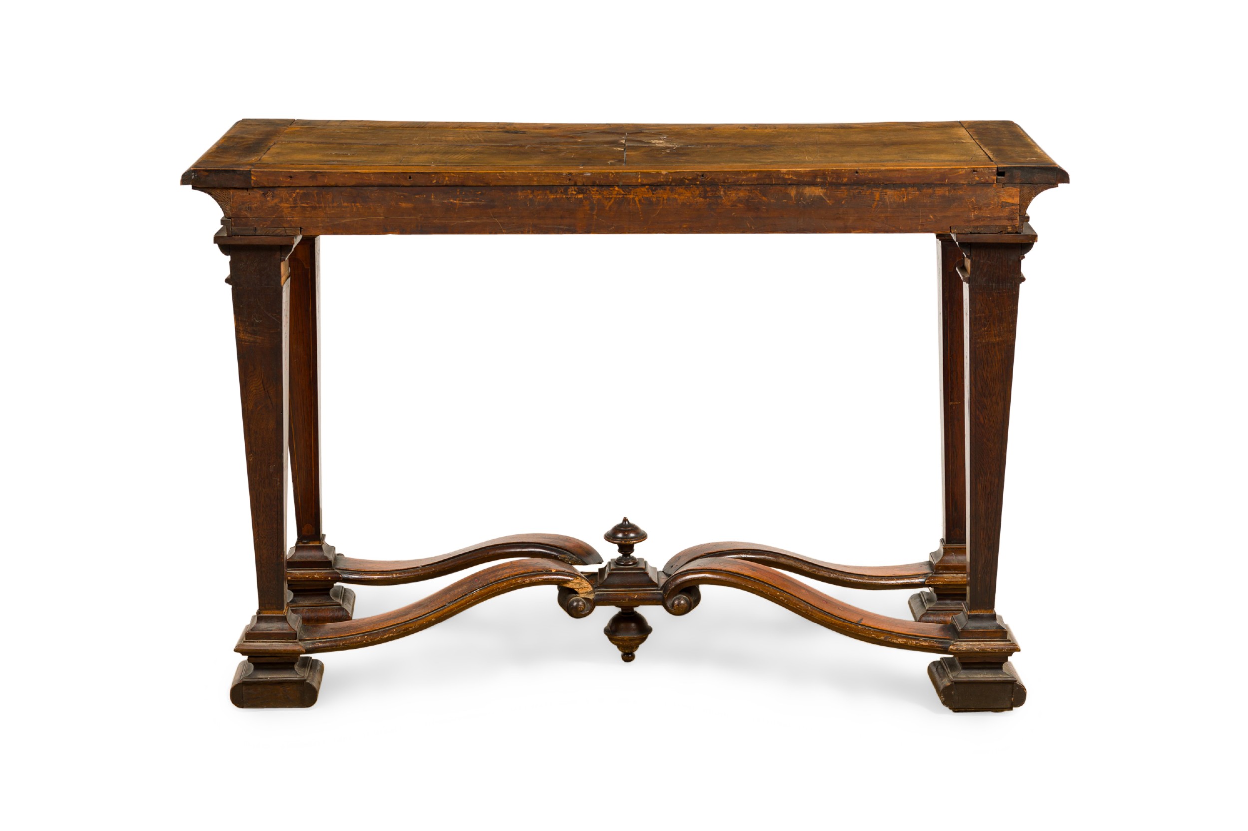 English Renaissance Burl wood Console table with 4 square tapered floral inlaid legs connected with a finial stretcher
