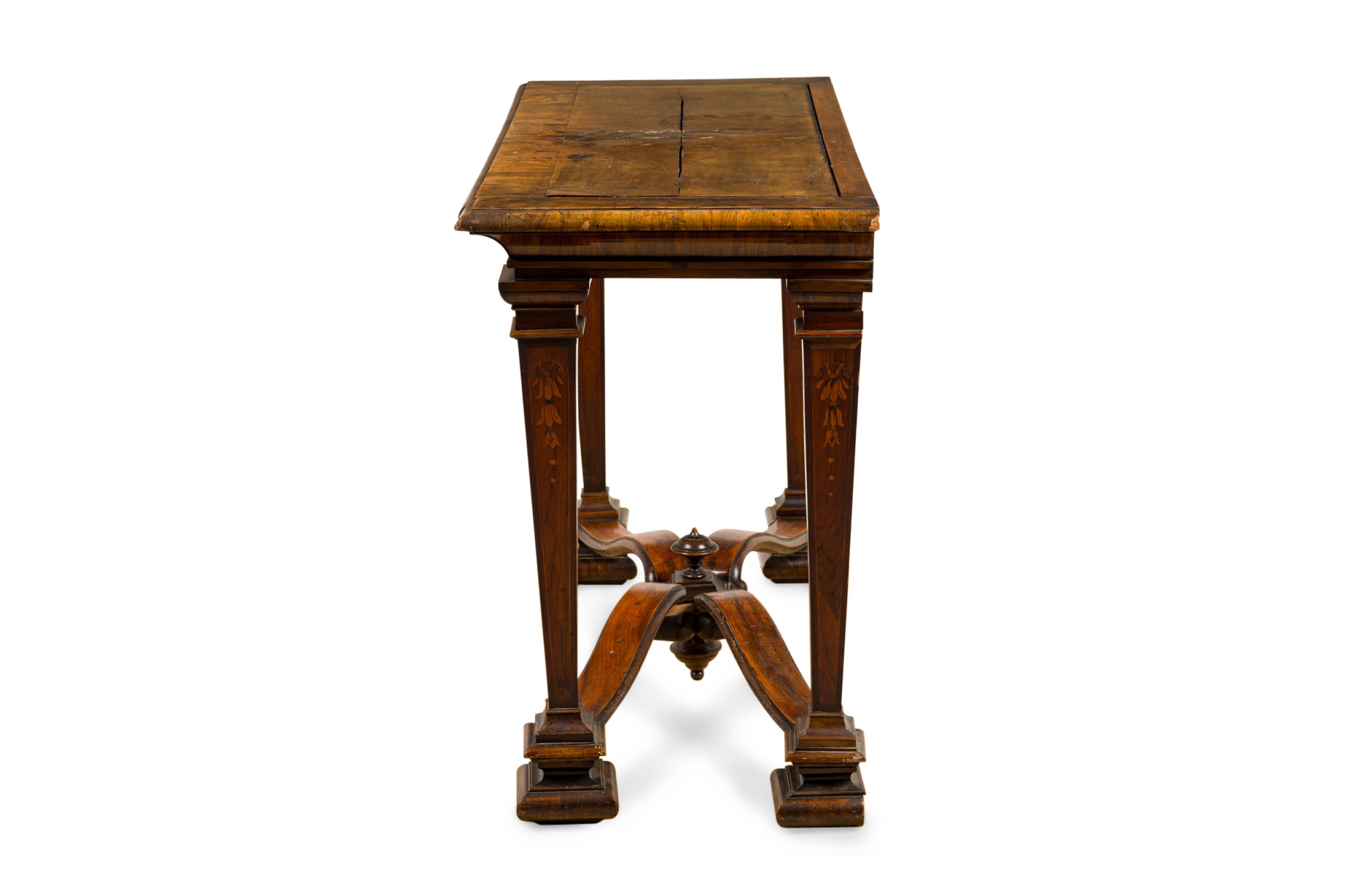 English Renaissance Burl wood Console table with 4 square tapered floral inlaid legs connected with a finial stretcher.
