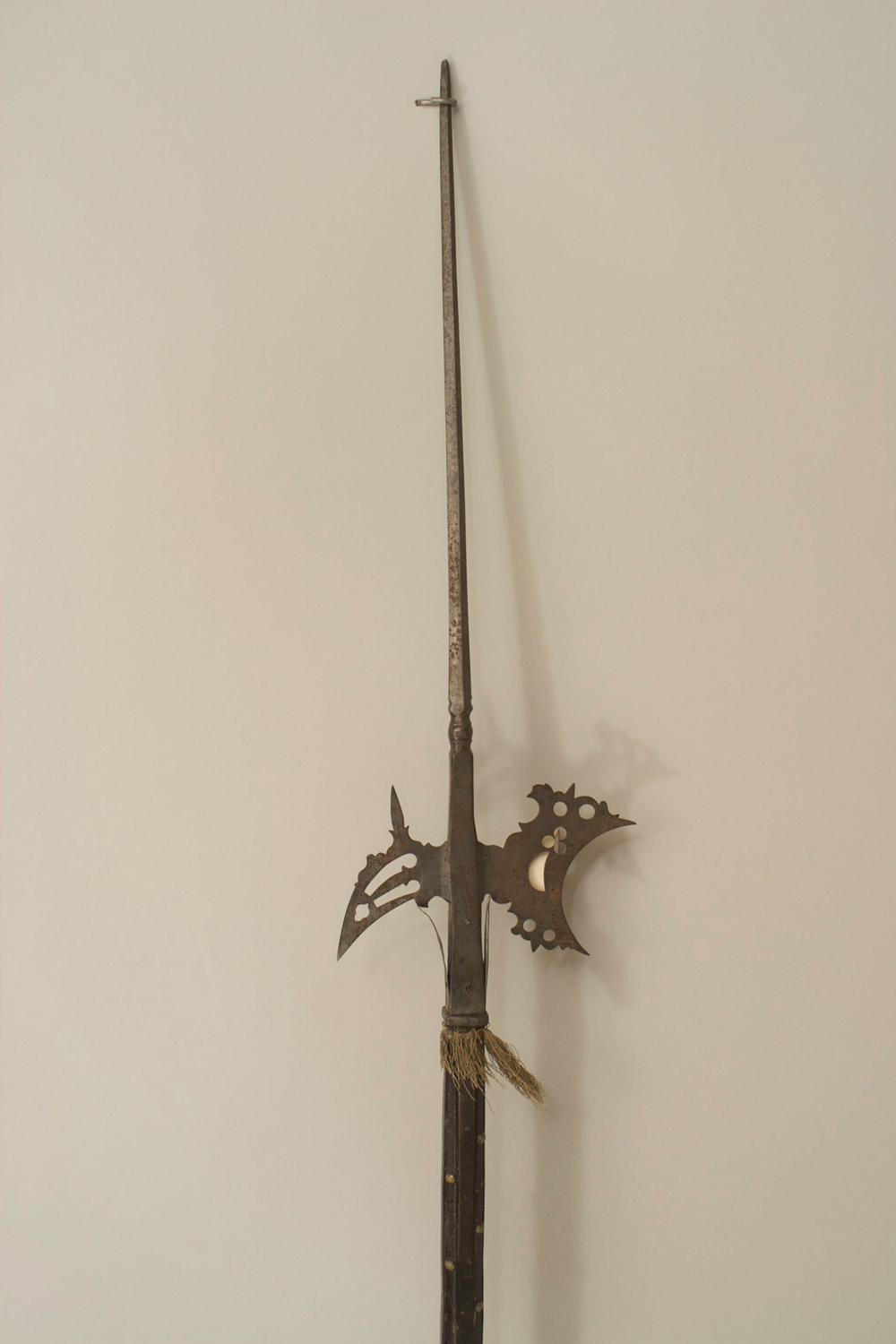 English Renaissance-style halberd spear with wooden shaft and small 29-inch iron ax blade..