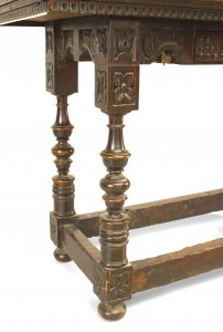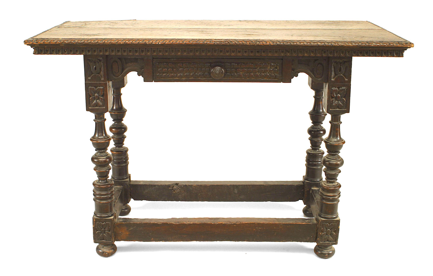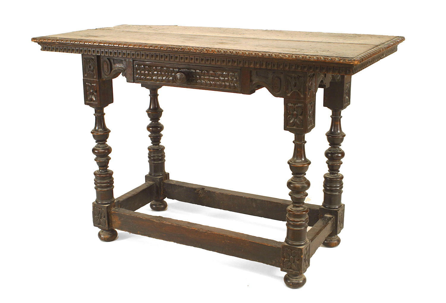 English Renaissance-style (19th Century) walnut carved console table with drawer and stretcher on turned legs..