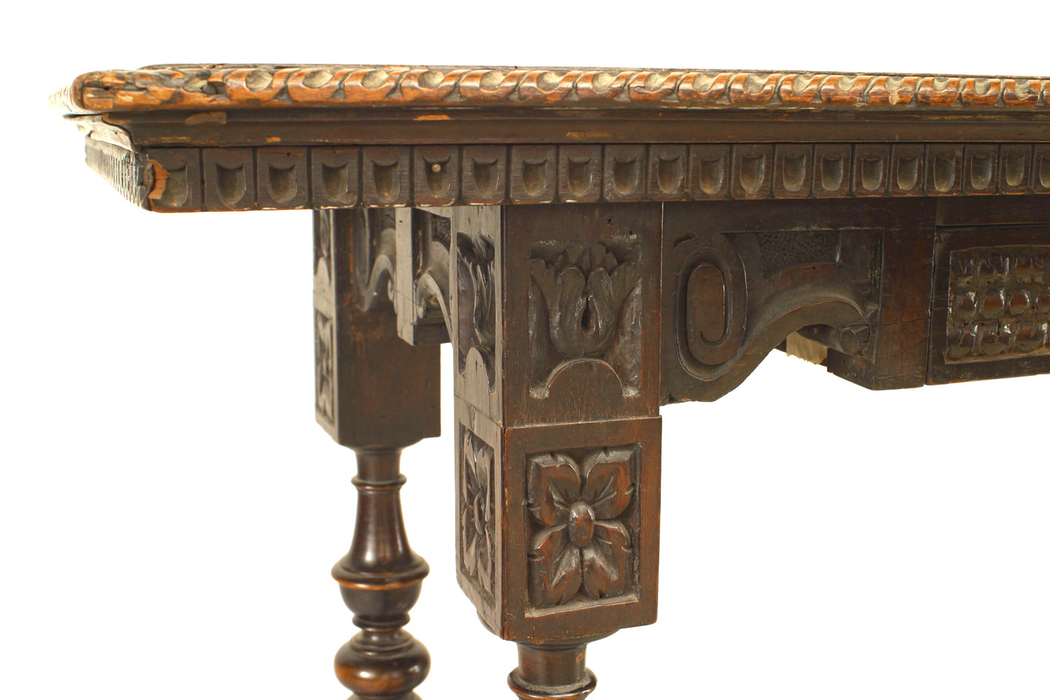 English Renaissance-style (19th Century) walnut carved console table with drawer and stretcher on turned legs.
