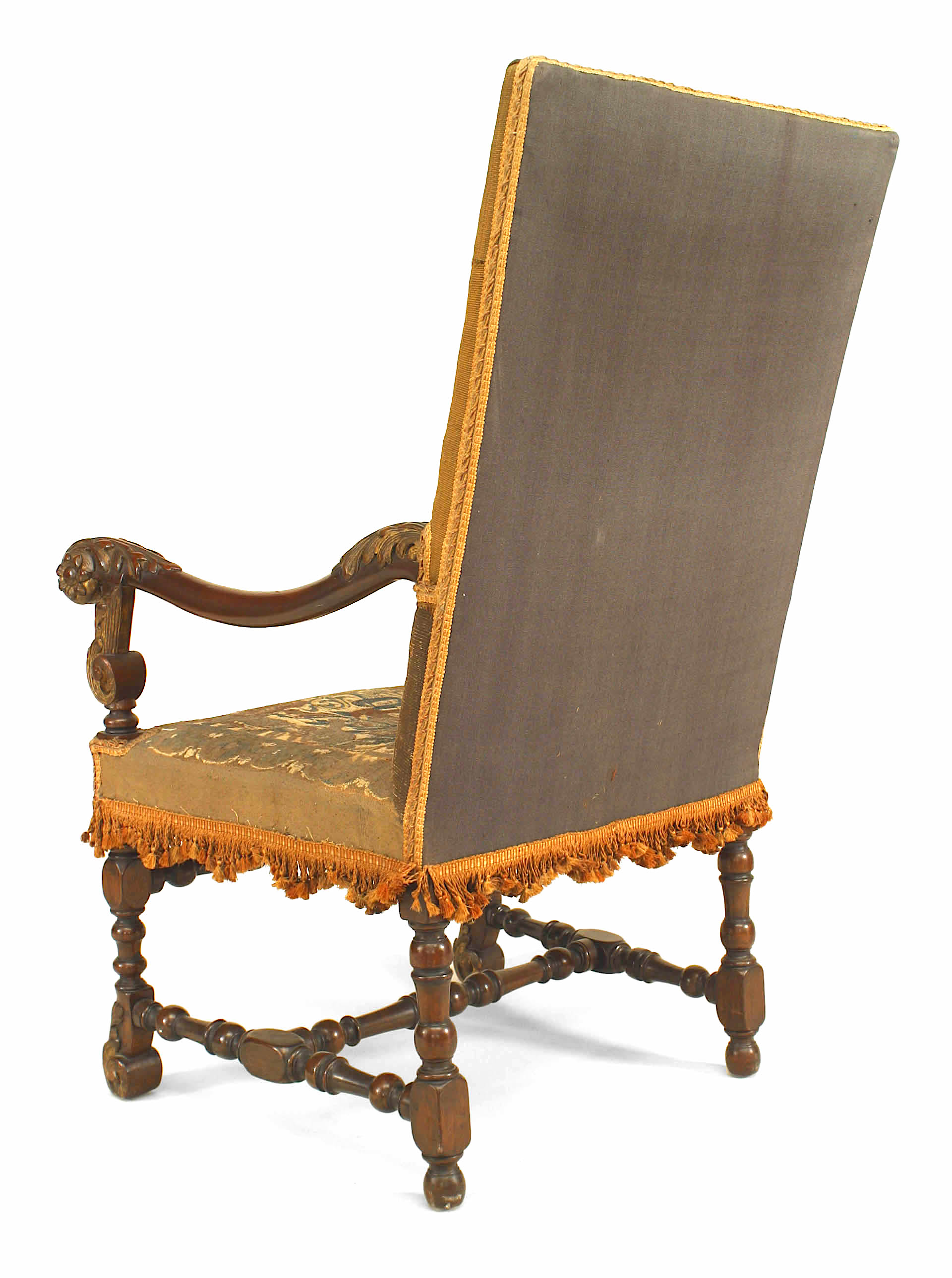 PAIR of English Renaissance style (19th Cent) walnut carved open Armchairs with 17/18th Cent tapestry upholstered seat and square back with a stretcher connecting the legs..