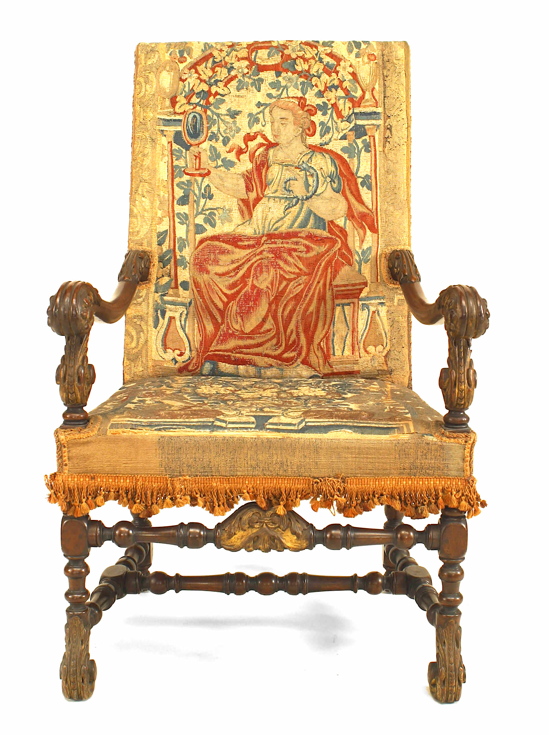 PAIR of English Renaissance style (19th Cent) walnut carved open Armchairs with 17/18th Cent tapestry upholstered seat and square back with a stretcher connecting the legs.