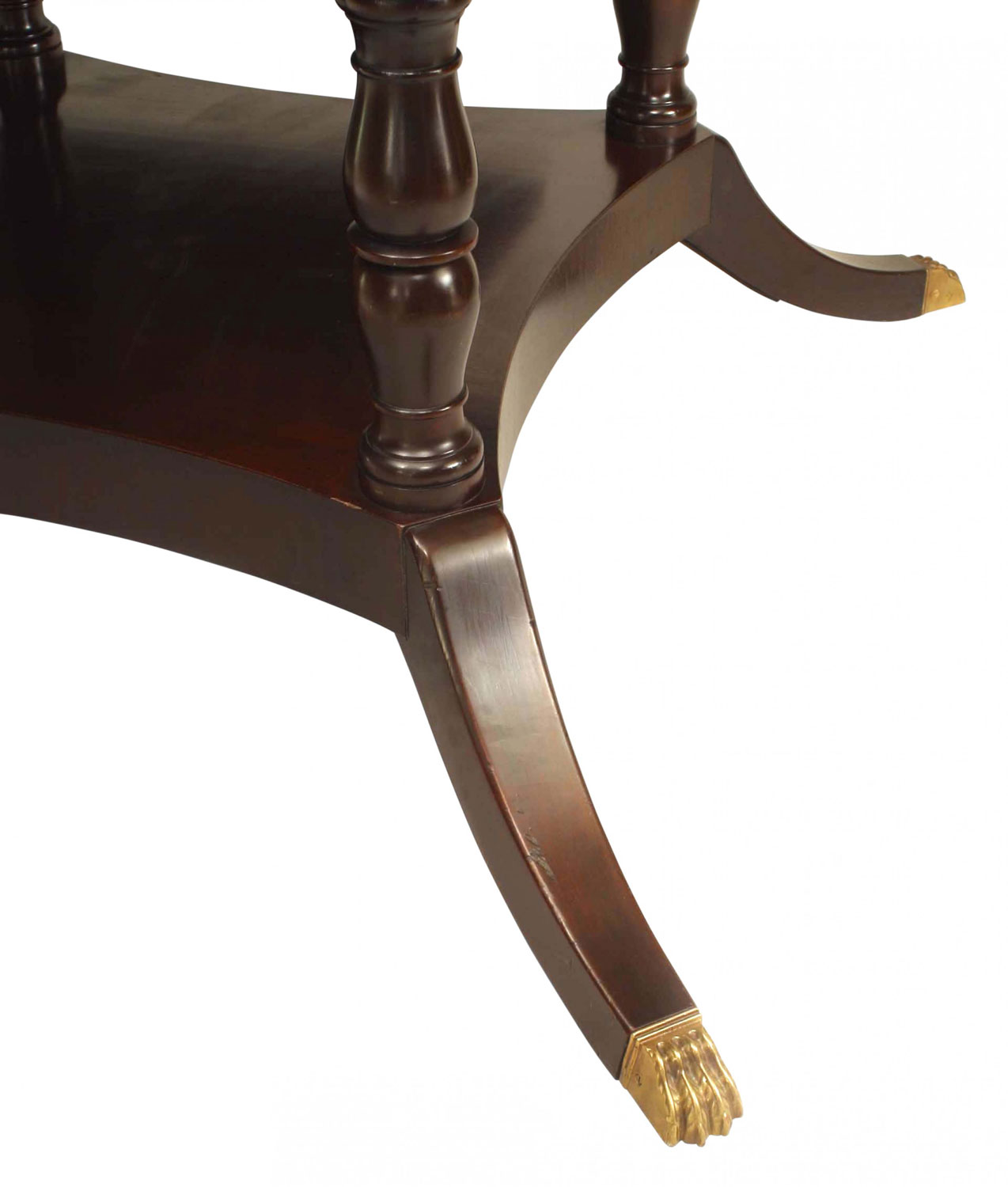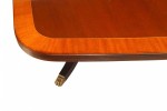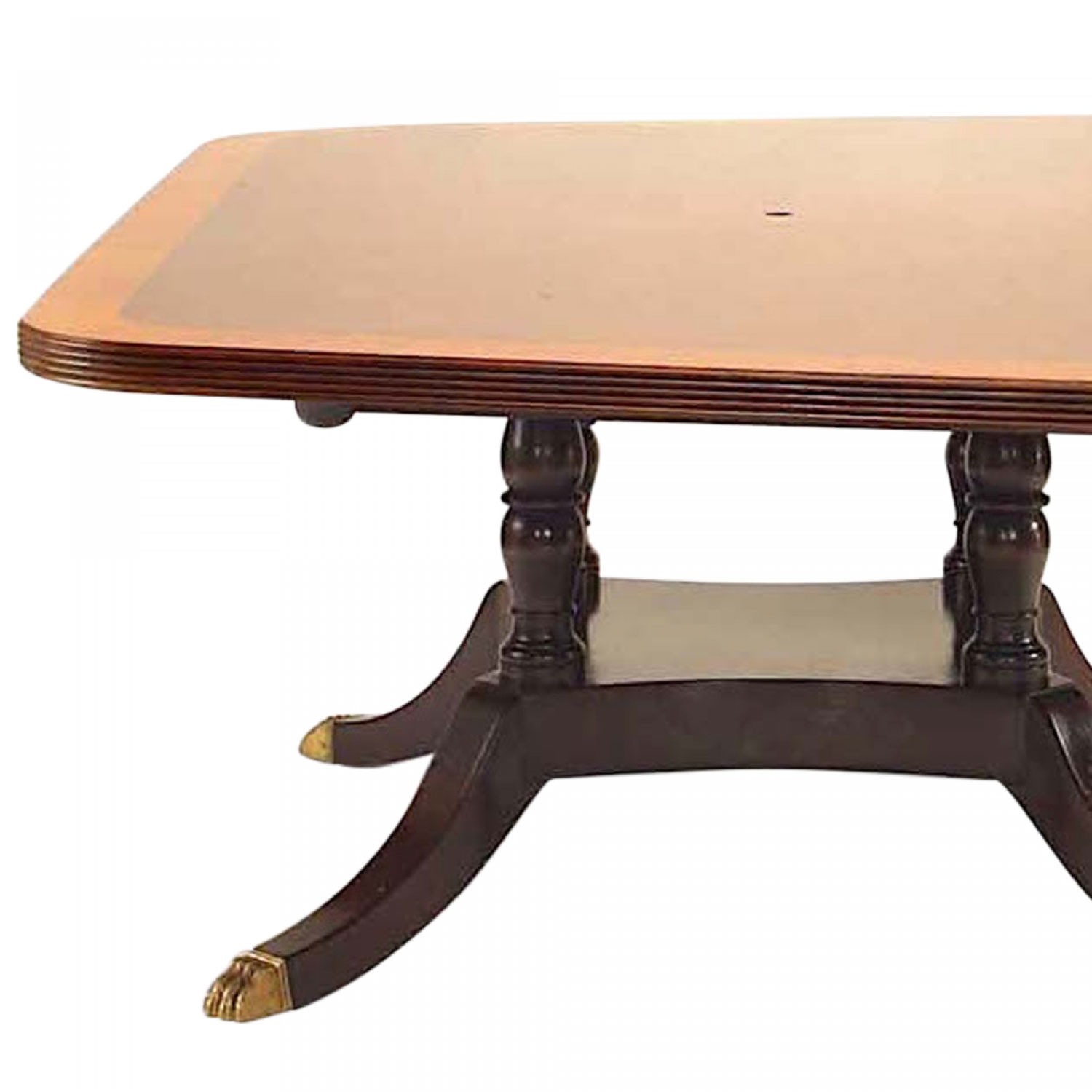 English Sheraton-style (20th Century) mahogany conference table with banded edge and bowed center in 4 sections on 3 splay foot pedestal bases with brass lion paw feet (KITTINGER)