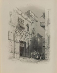 English Victorian steel plate engraving of a streetscape with figures by a doorway (19th-Century) in a black and gold decorative frame. (Written on back of frame - titled: "The Convent Gate" 1856 // England). (Similar to MP2344)..