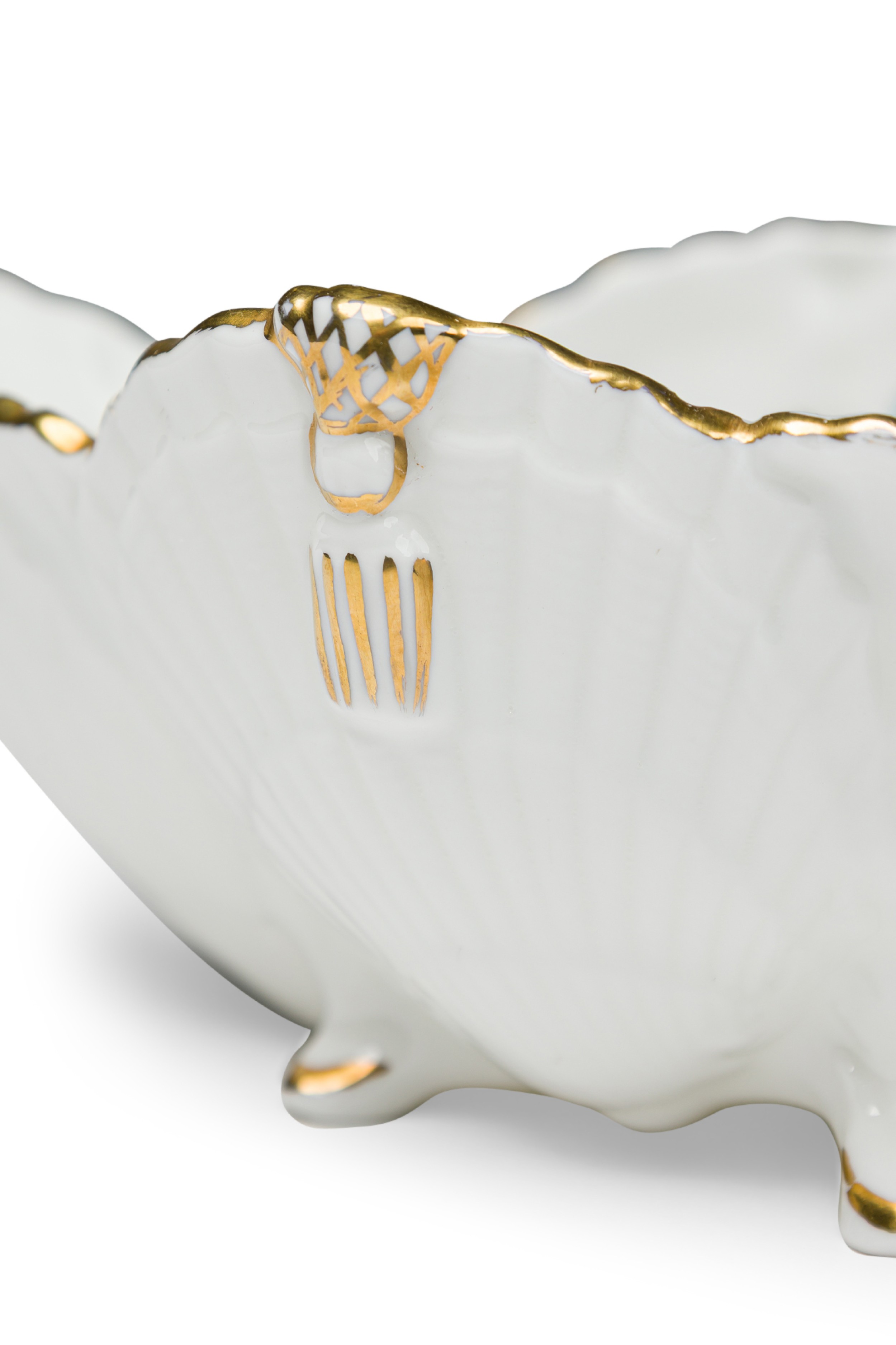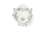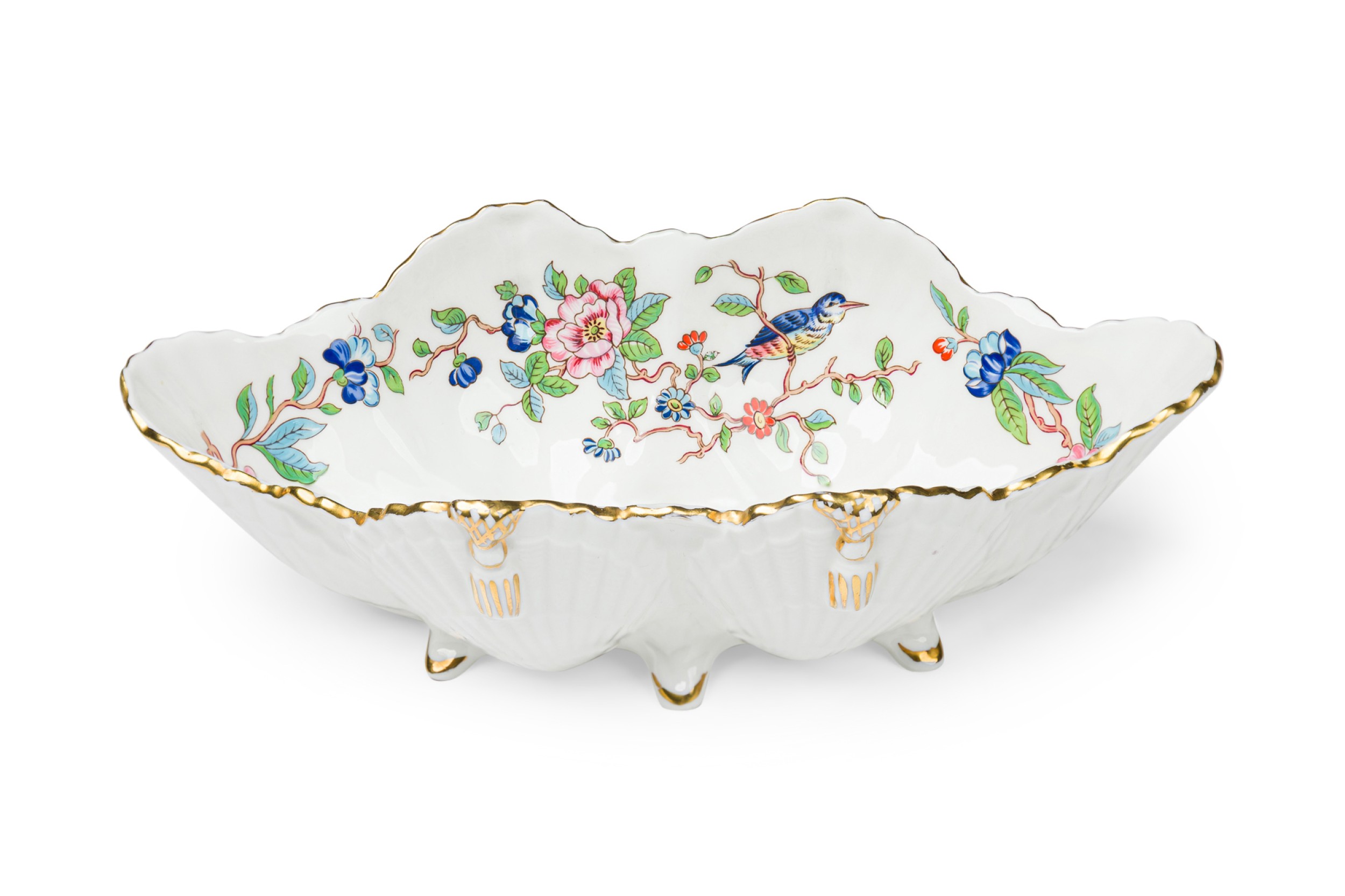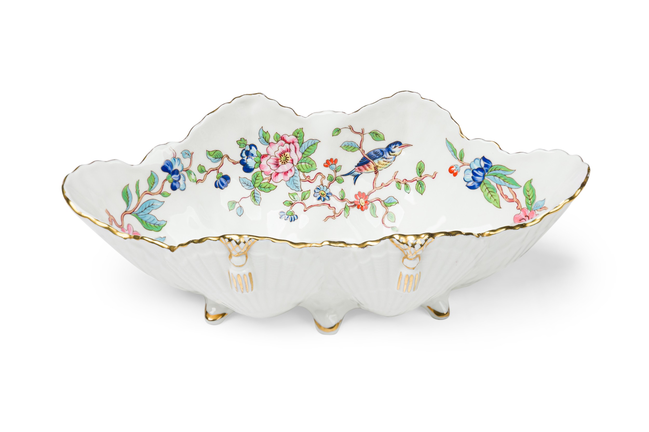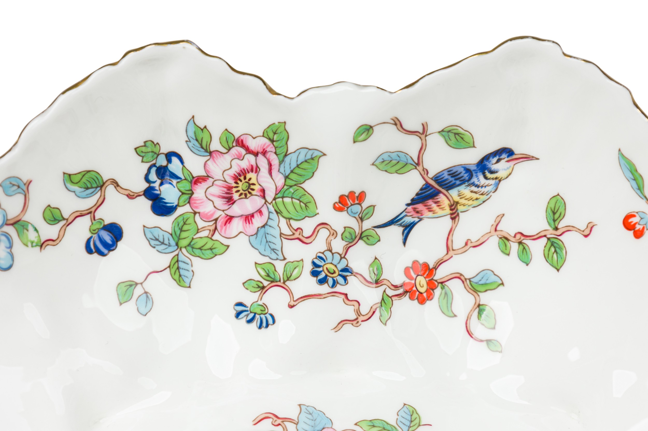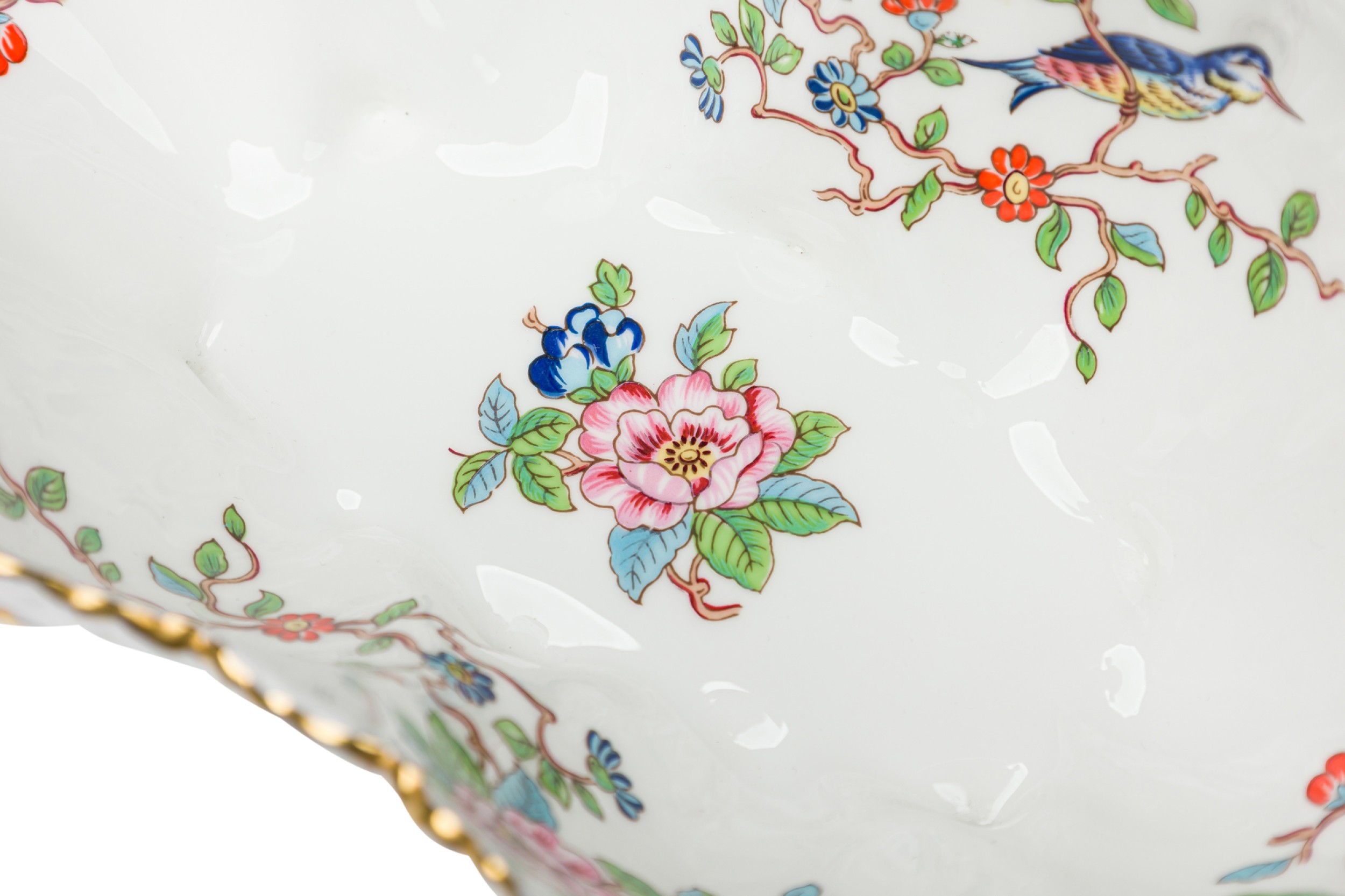 English Victorian style bone china footed bowl having gilt trimmed scalloped edges with floral and bird design (AYNSLEY PEMBROKE).