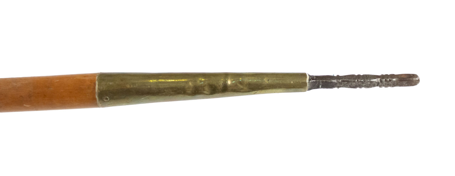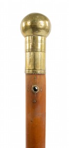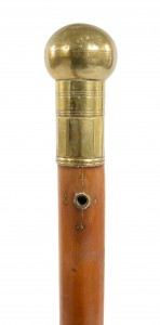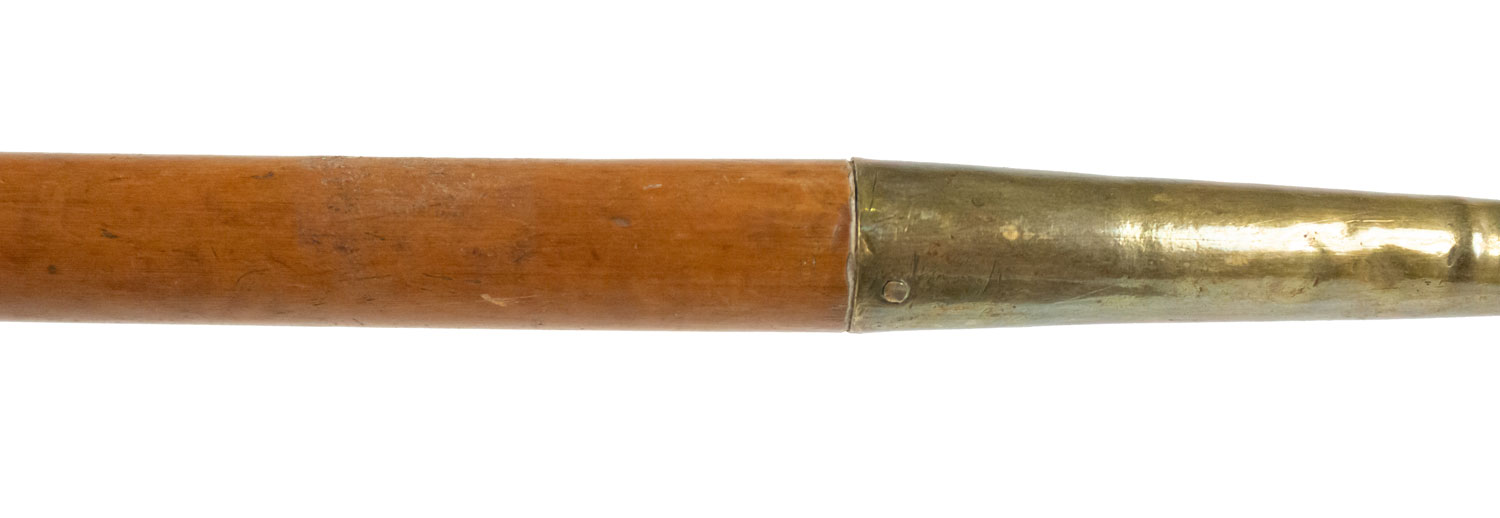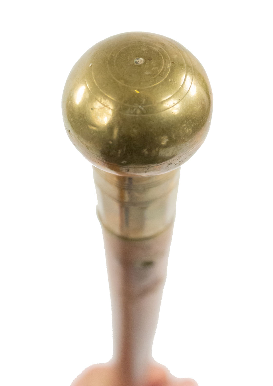 English Victorian-style light wood cane with brass ball top and fluted sleeve.