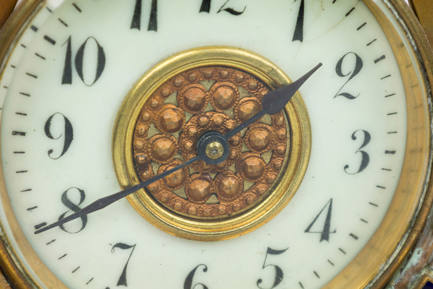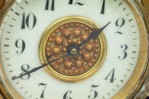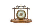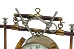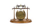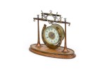 English Victorian brass horseshoe shaped desk clock with copper trumpets on oval shaped oak base. (Not working).