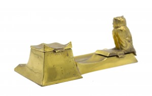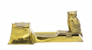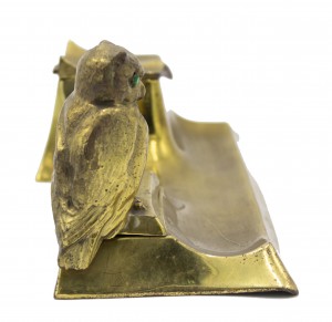 English Victorian brass owl inkwell on rectangular tray.