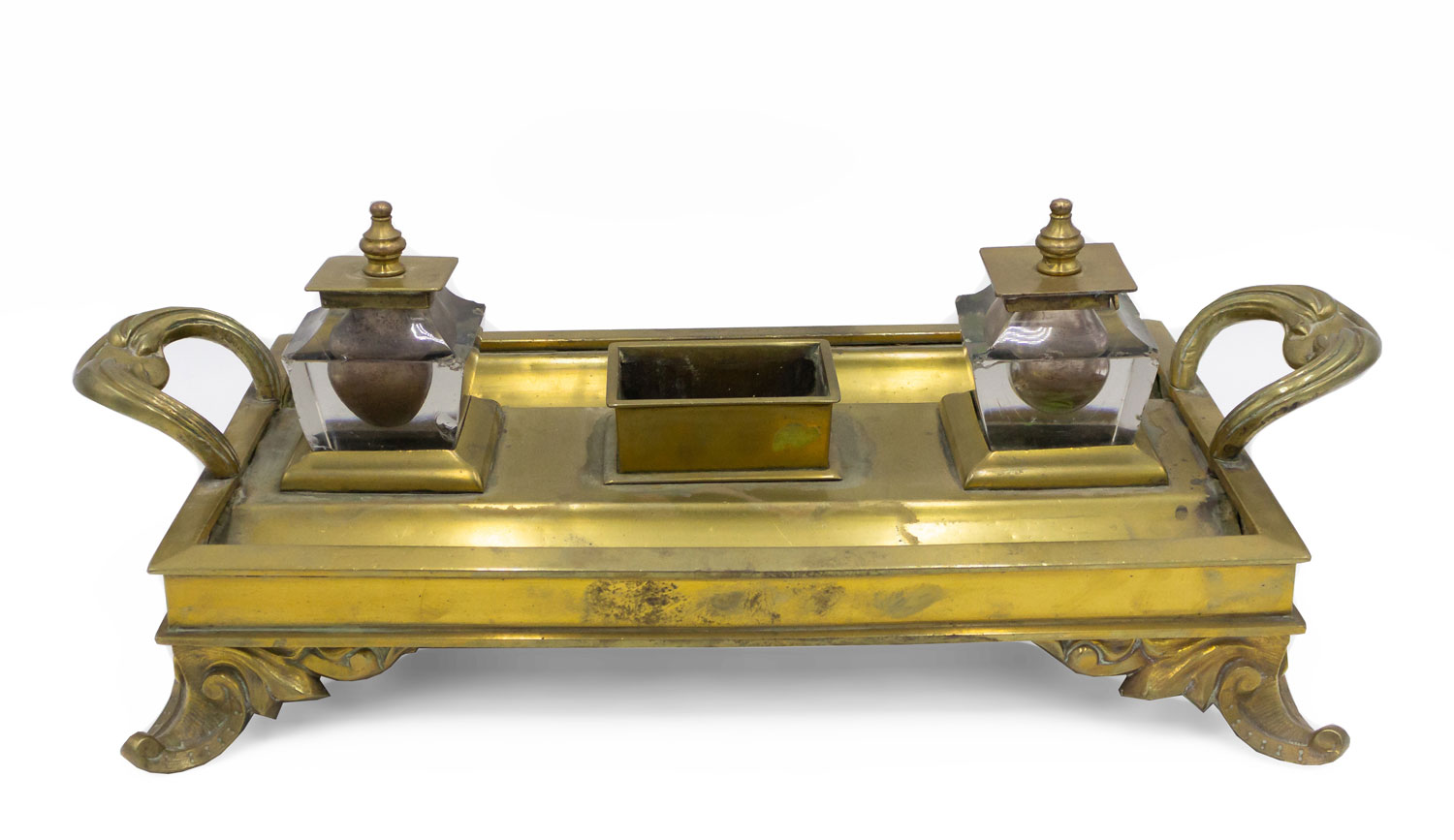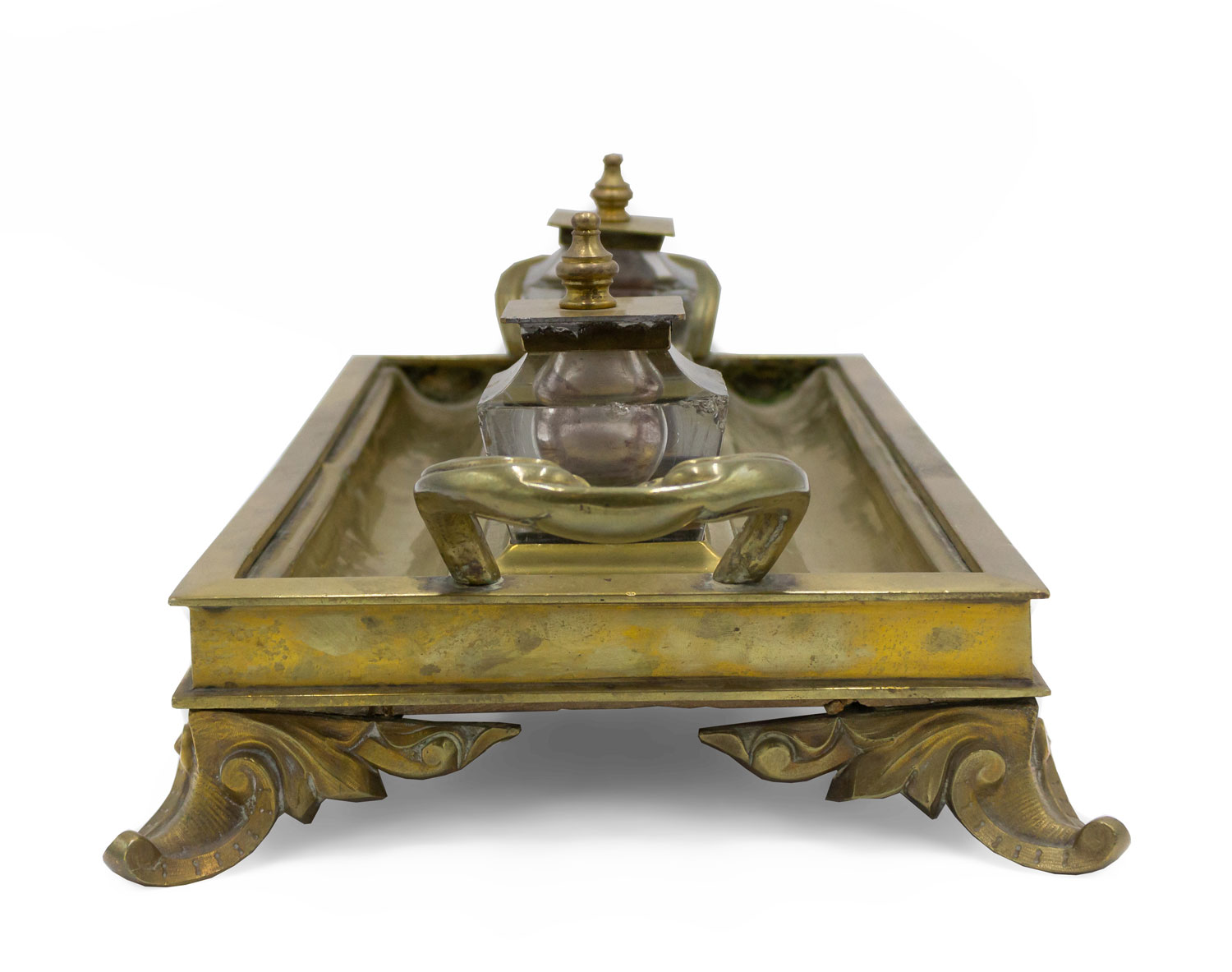 English Victorian bronze inkwell with 2 crystal wells with finial tops and side handles on 4 scroll legs..