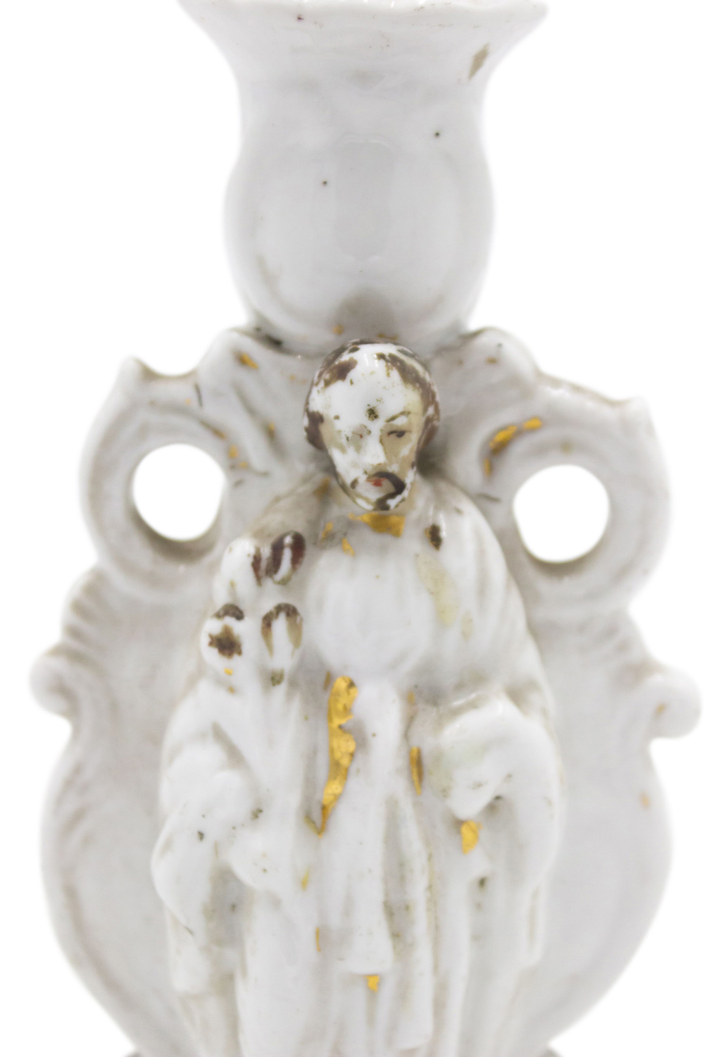 English Victorian Chelsea porcelain candlestick with religious figure.