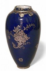 English Victorian cobalt blue porcelain vase with gold scroll design and enamel trim (Crown Derby)..