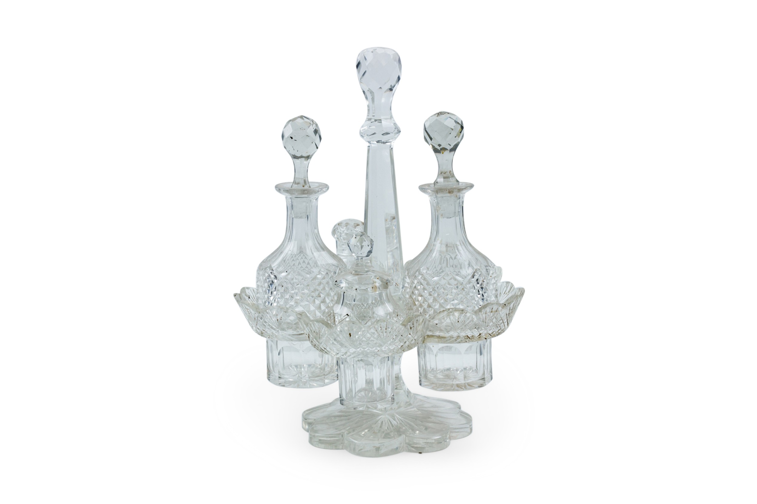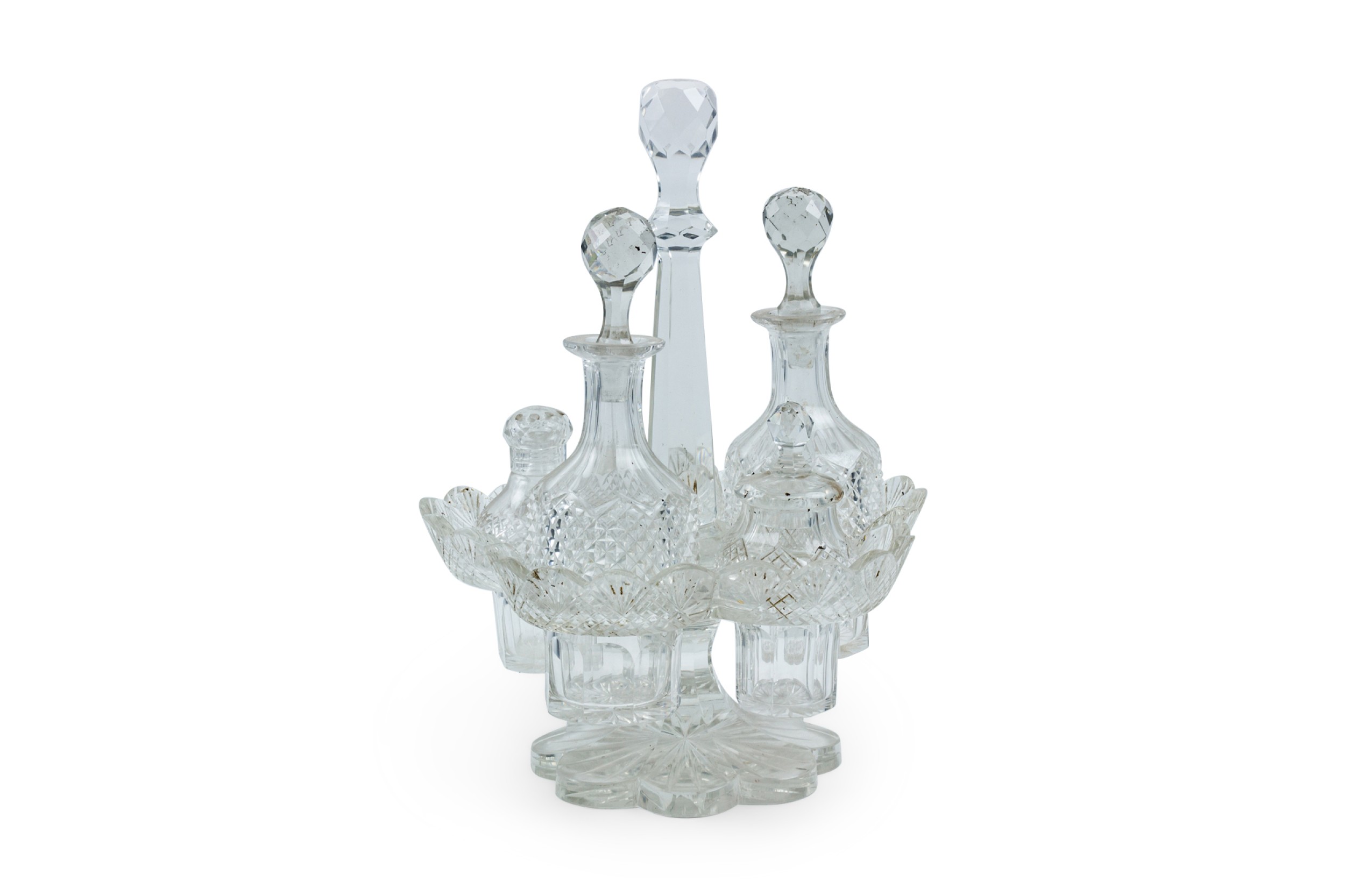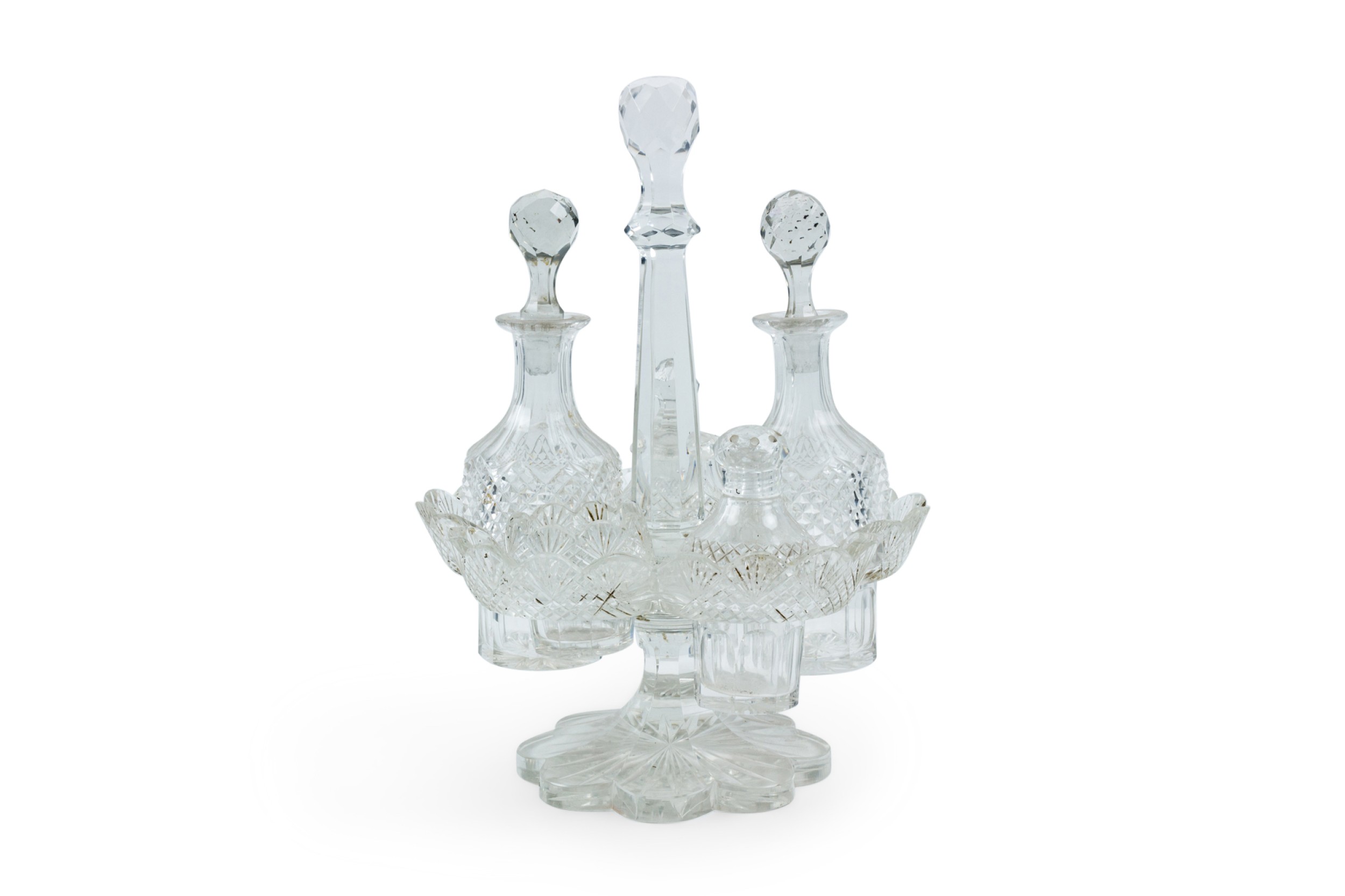 English Victorian cut crystal cruet set with 5 containers in scalloped holder.