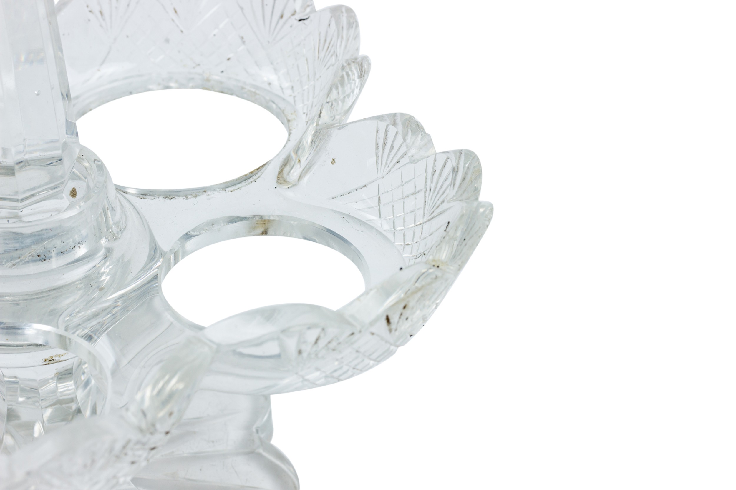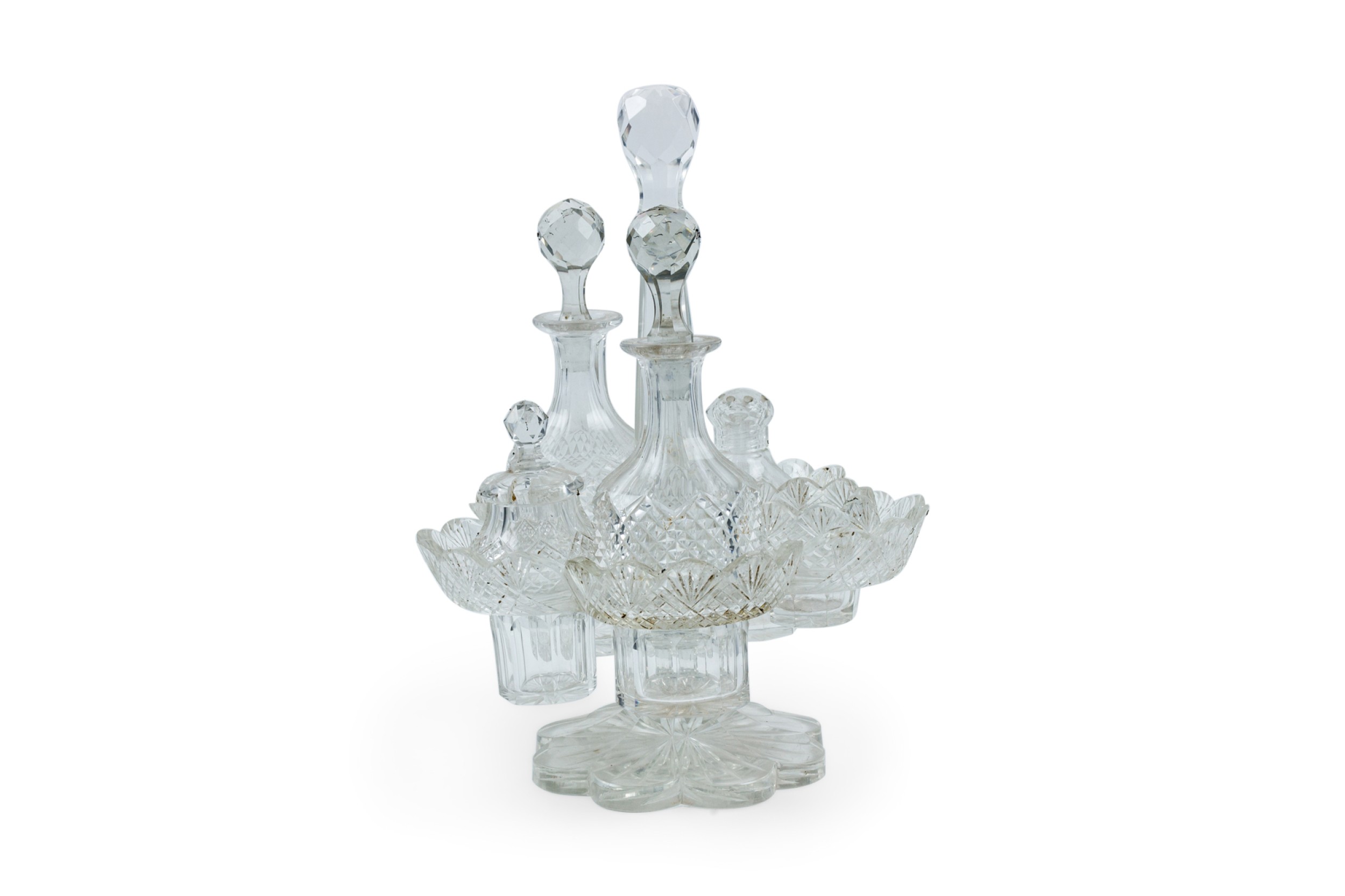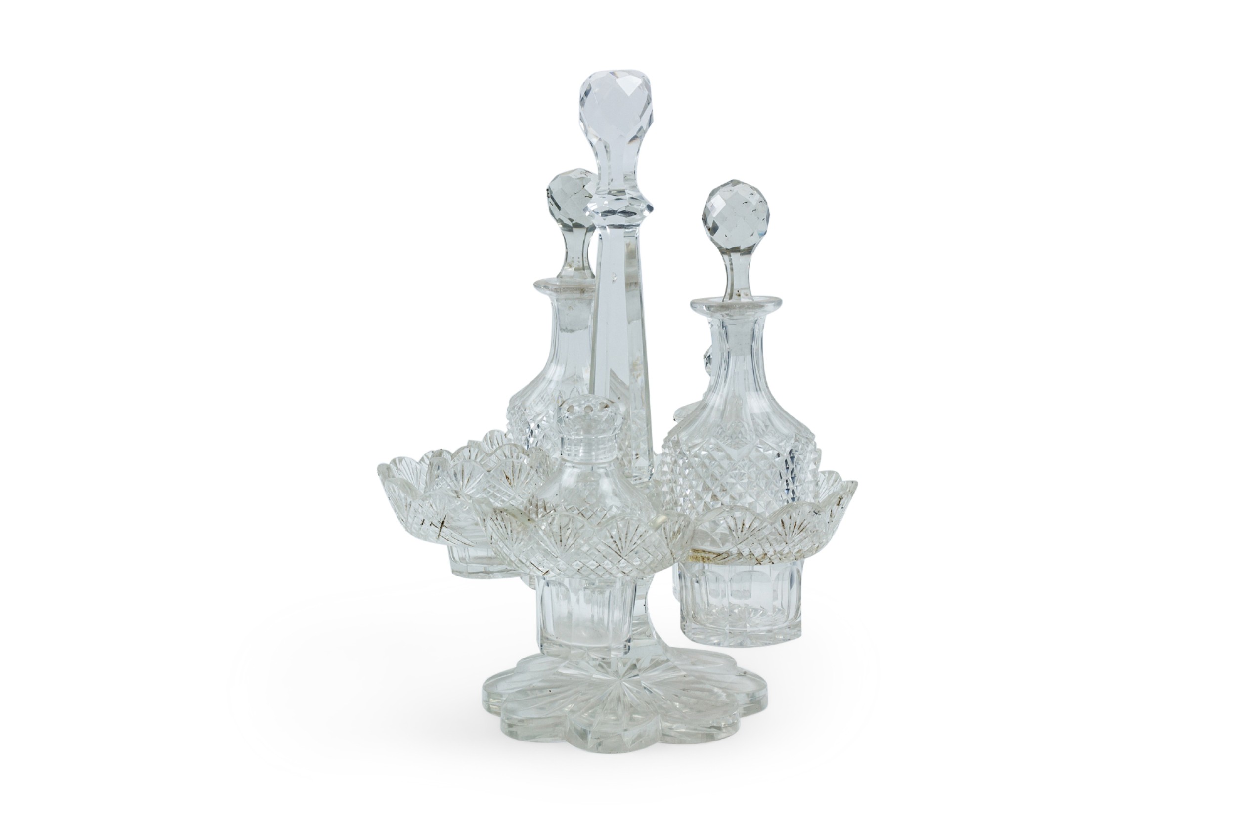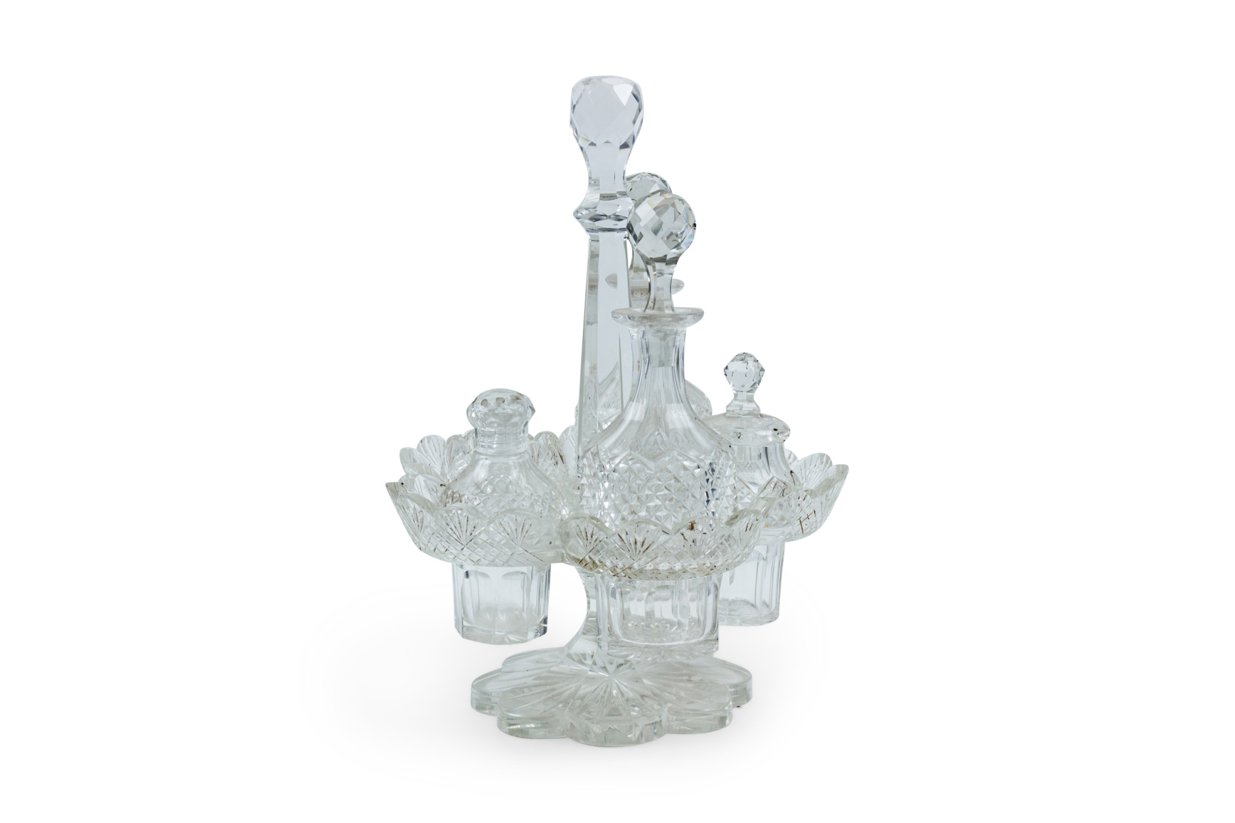 English Victorian cut crystal cruet set with 5 containers in scalloped holder