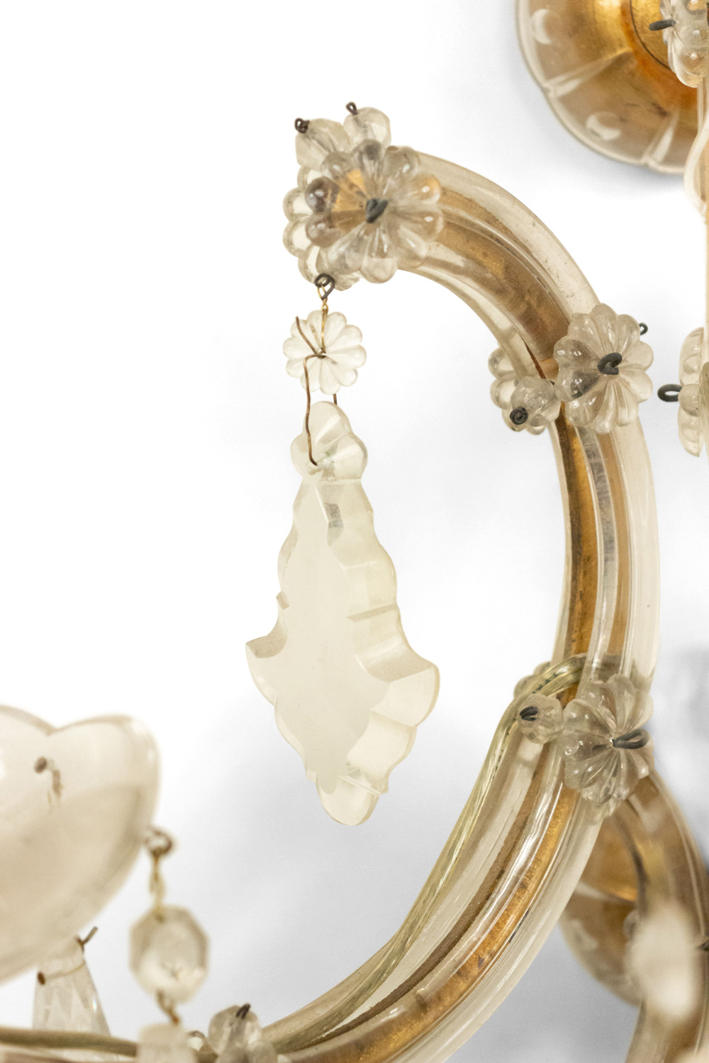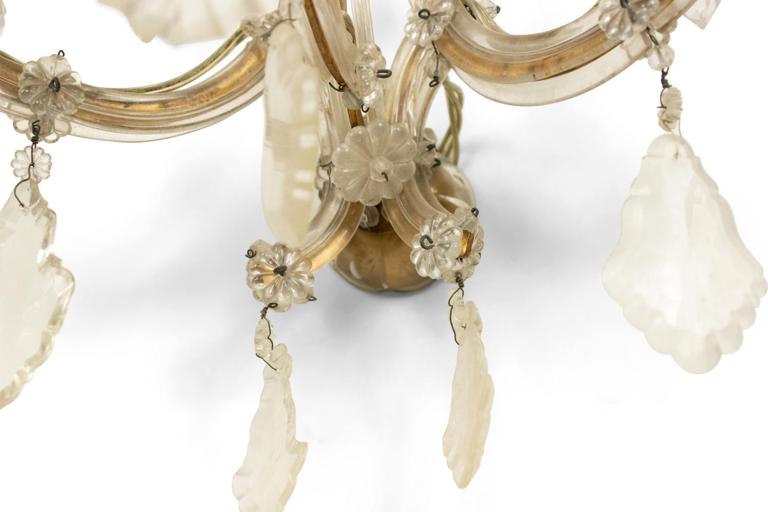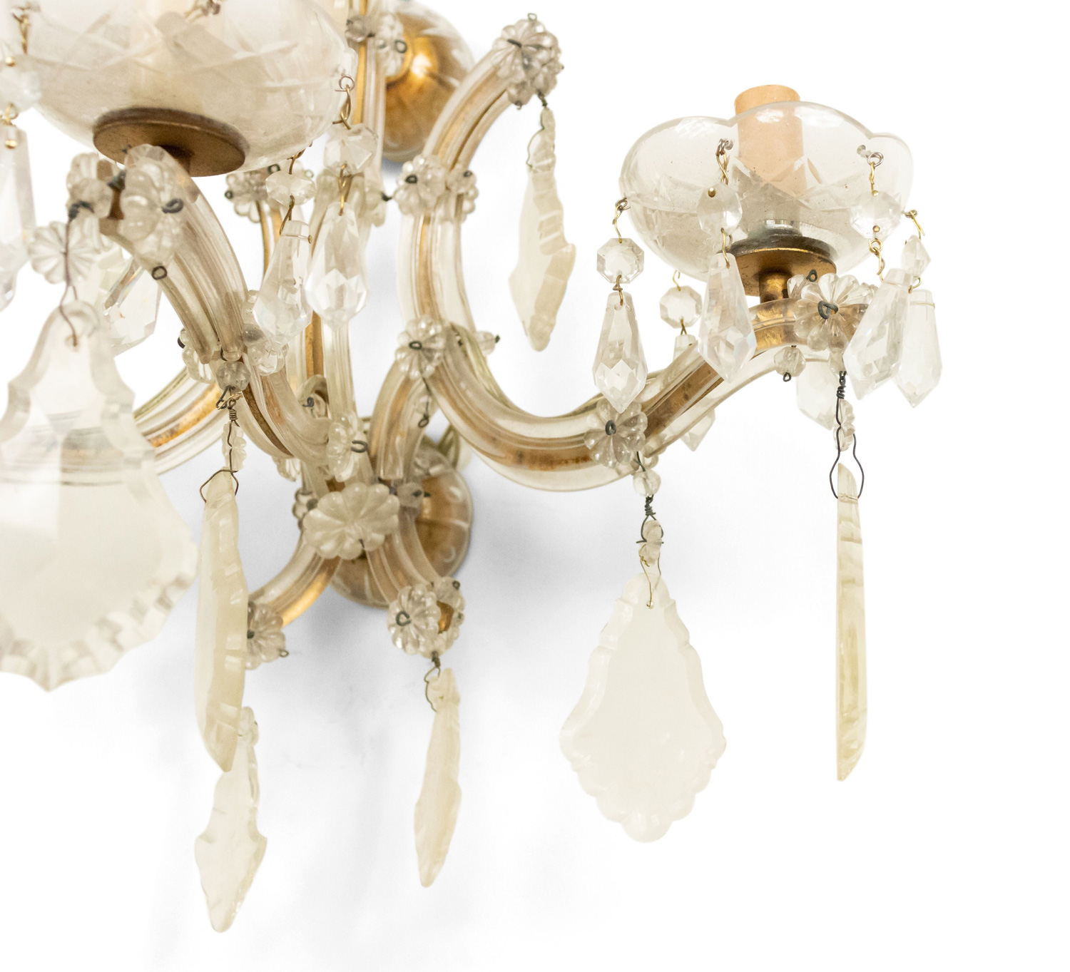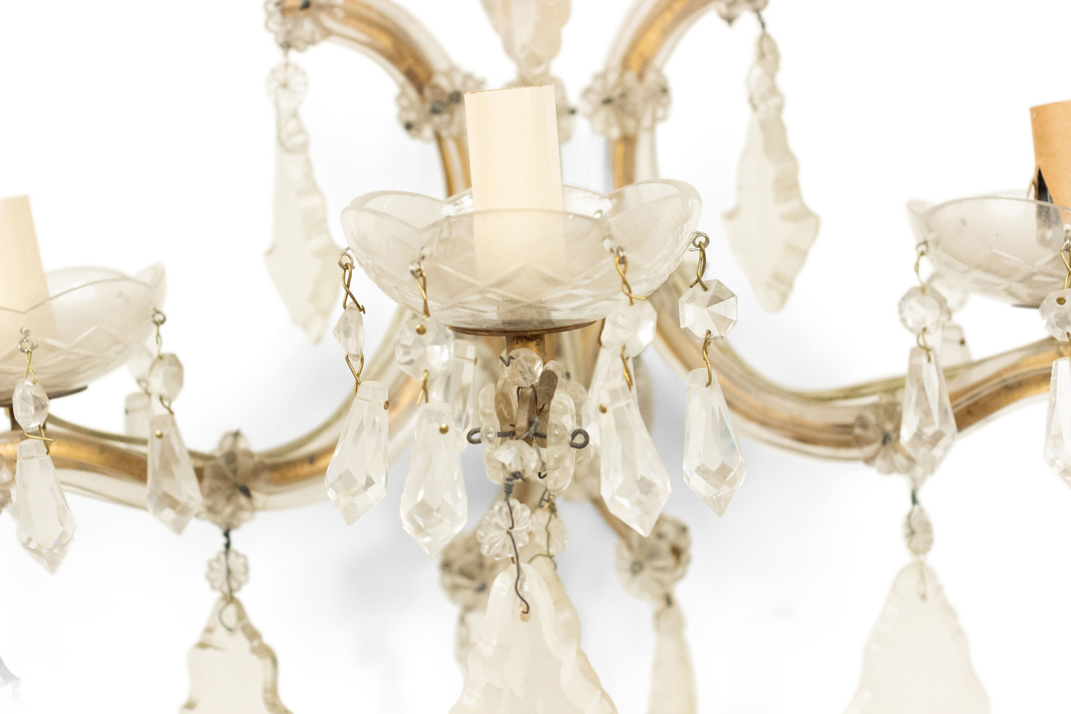 English Victorian style (20th Century) gilt metal and crystal wall sconce with three arms, dangling crystals, and etched bobeches.