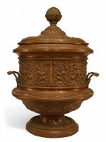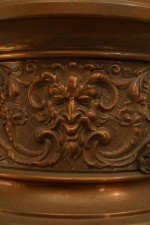 English Victorian hammered copper round centerpiece with scroll design and cover with brass finial and handles.