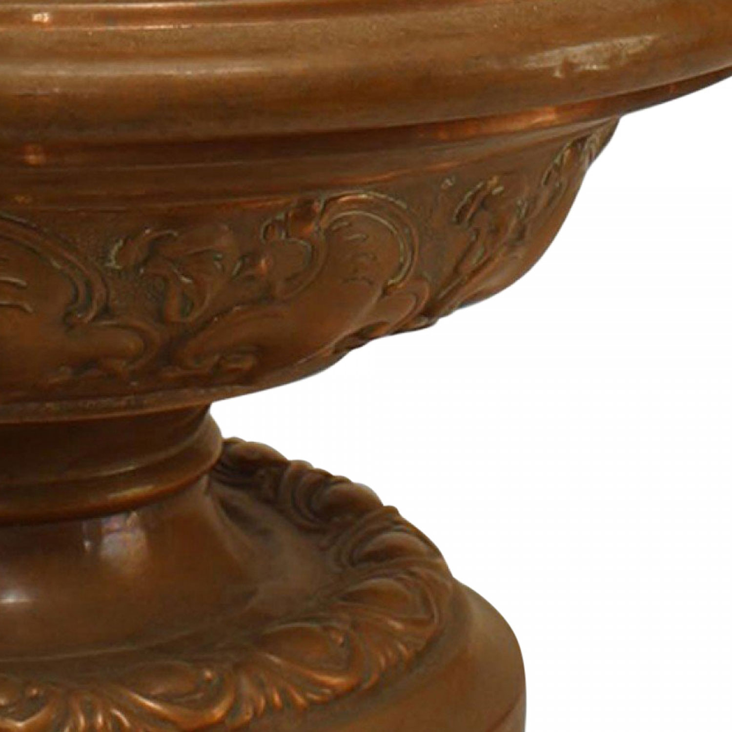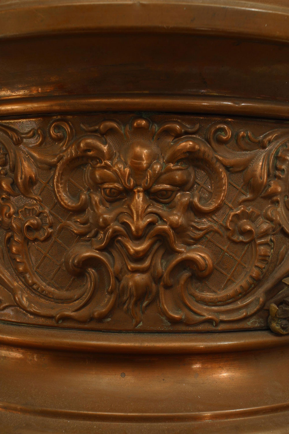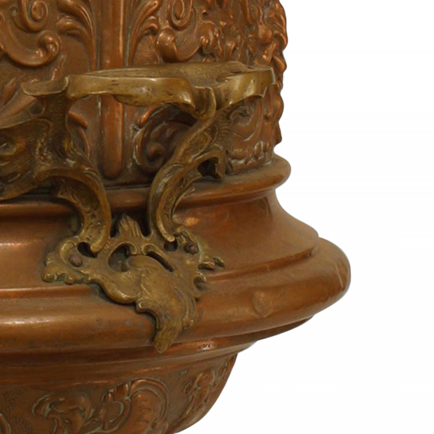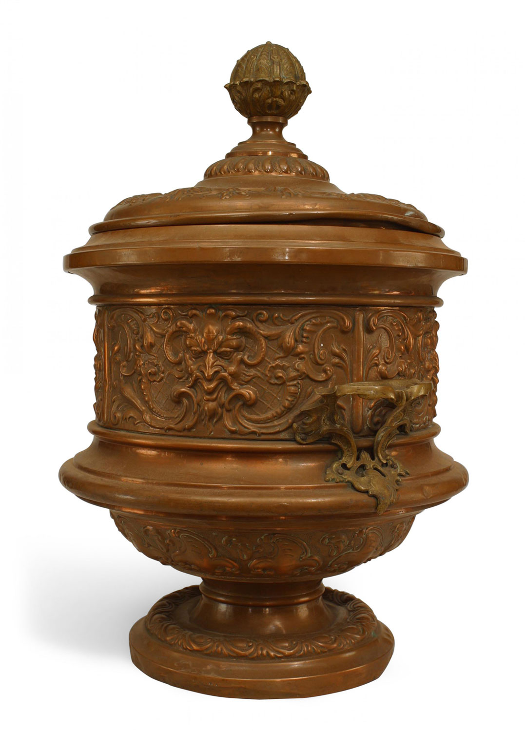 English Victorian hammered copper round centerpiece with scroll design and cover with brass finial and handles