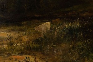 English Victorian carved gilt framed oil landscape painting of cows by stream (Walt Williams).