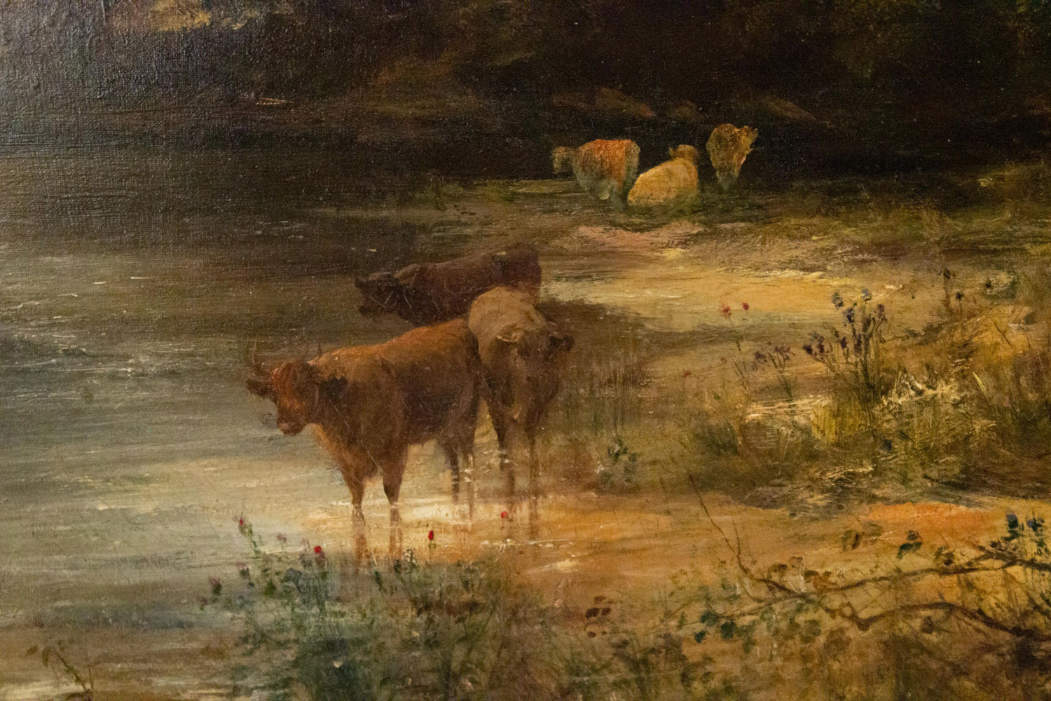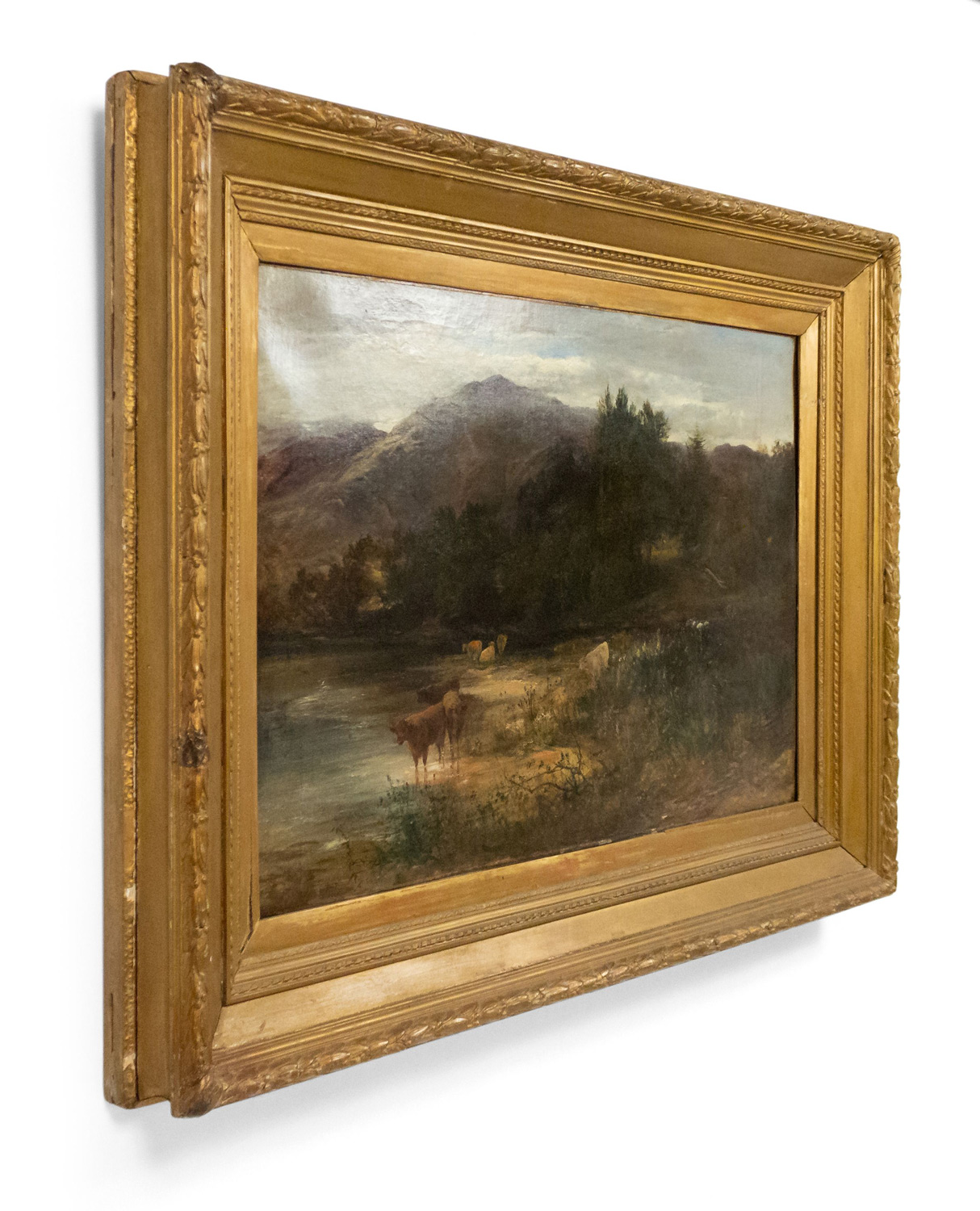 English Victorian carved gilt framed oil landscape painting of cows by stream (Walt Williams)