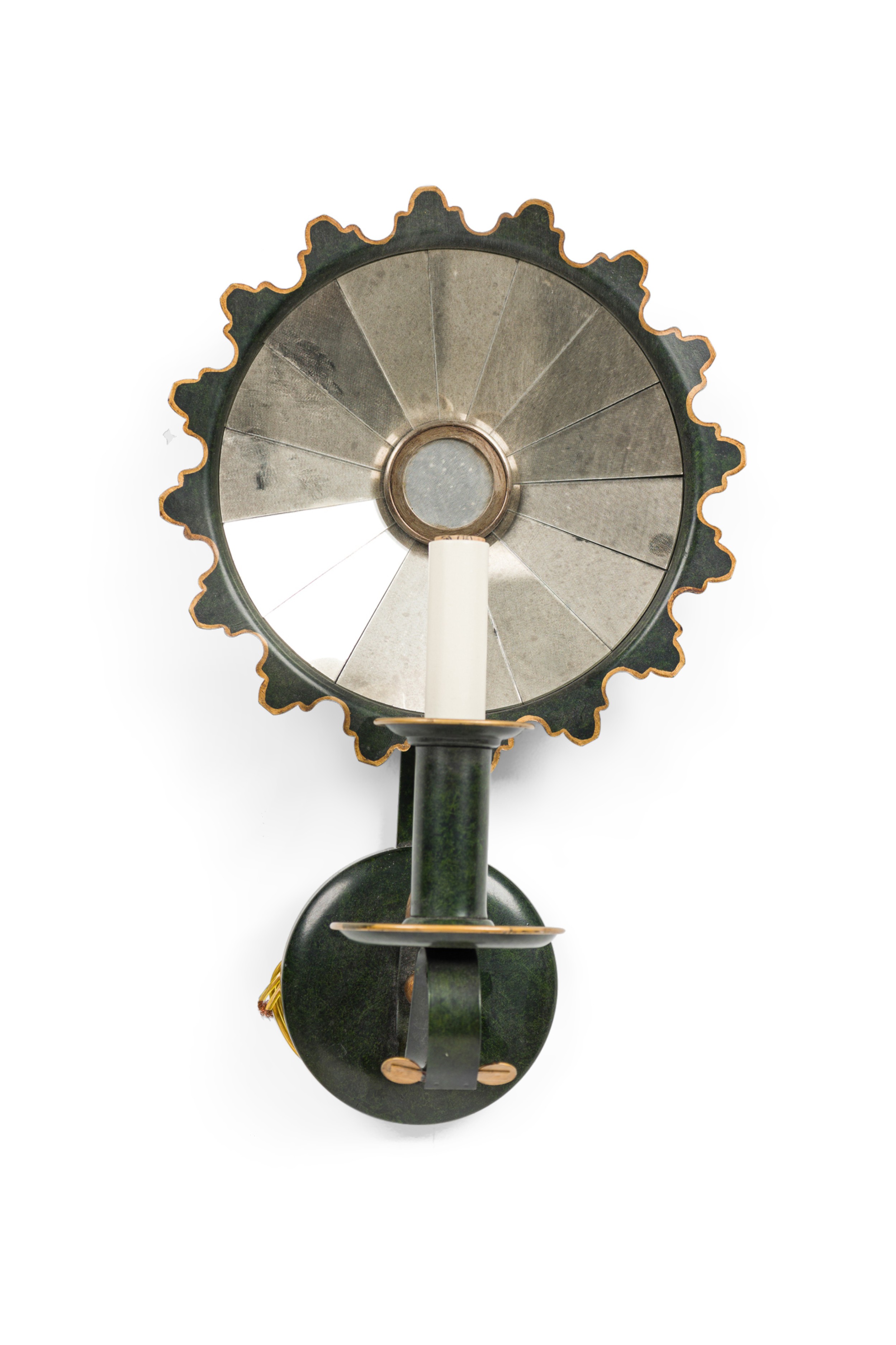 English Victorian tole sconce with a mirrored backplate and classic candle holder defined with gold paint on the edges (marked: VAUGHAN)
