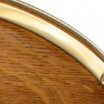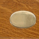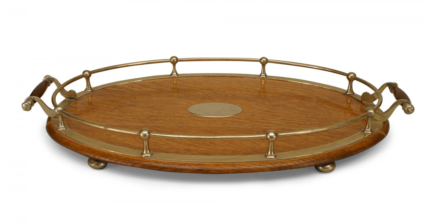 Style: English Materials & Techniques: Oak, silver Category: Dining Room Condition: One silver pyramid finial is missing from the tray's handle.