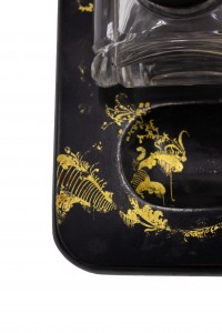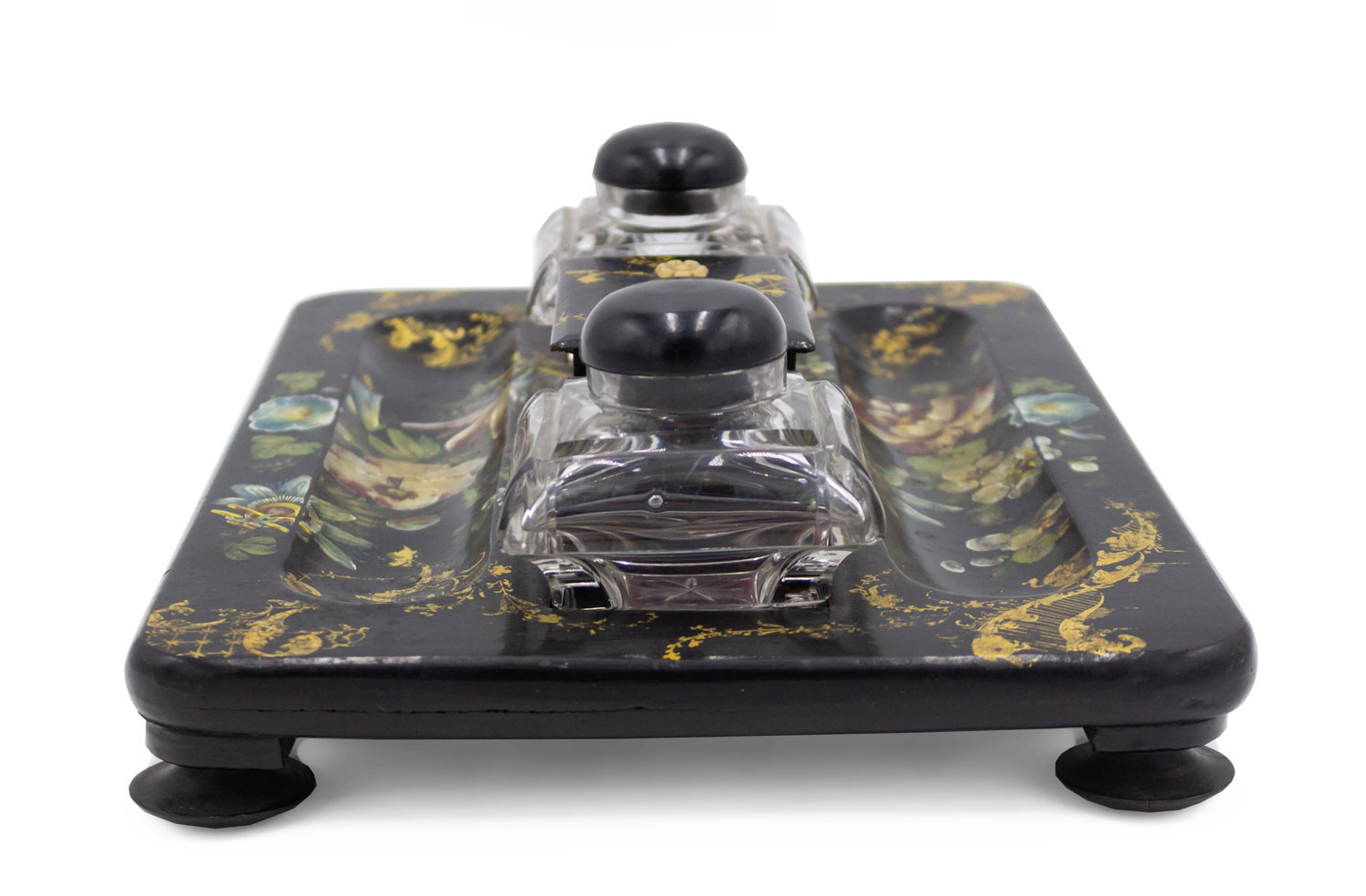 English Victorian papier mache rectangular inkwell with gold stenciled and floral painted decoration with a small center box between 2 square shaped wells.