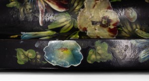English Victorian papier mache rectangular inkwell with gold stenciled and floral painted decoration with a small center box between 2 square shaped wells..