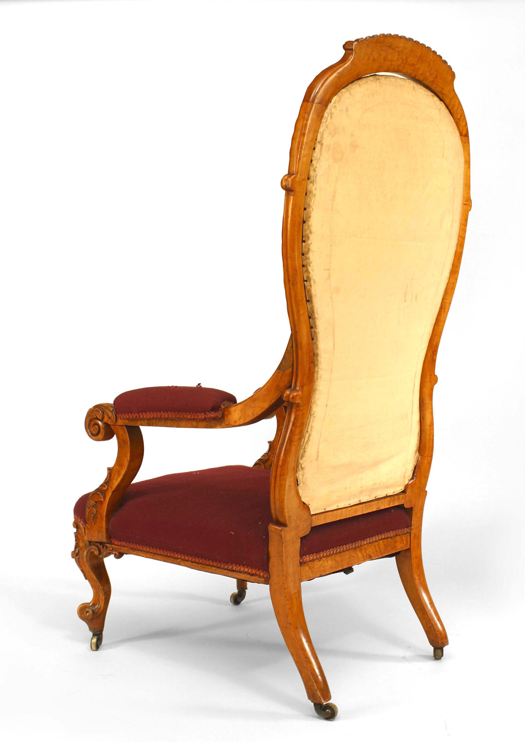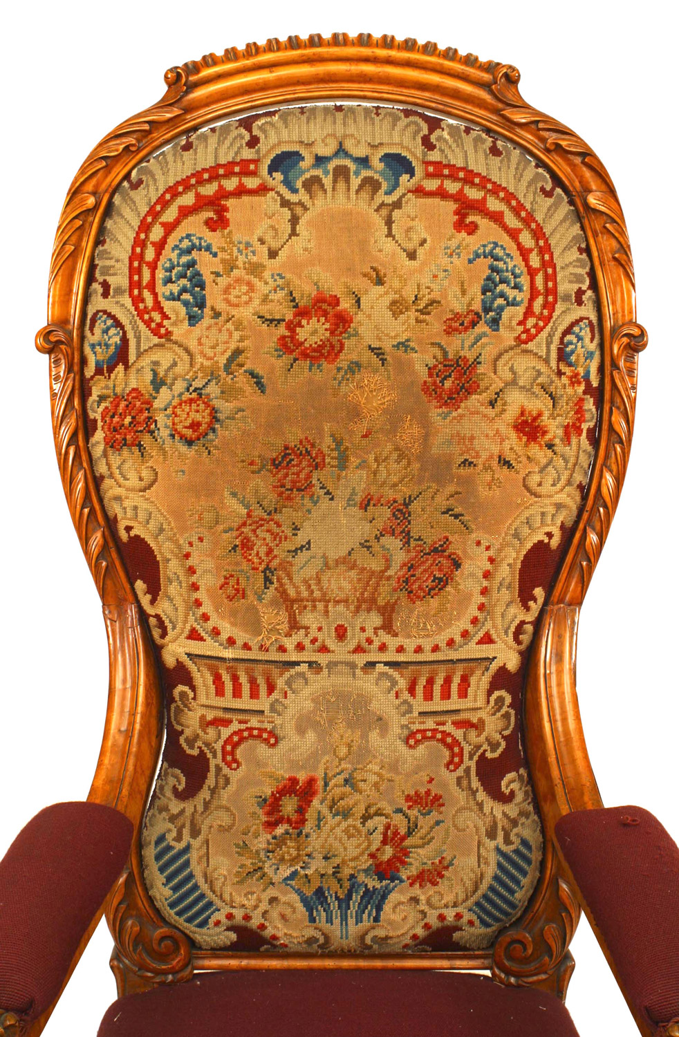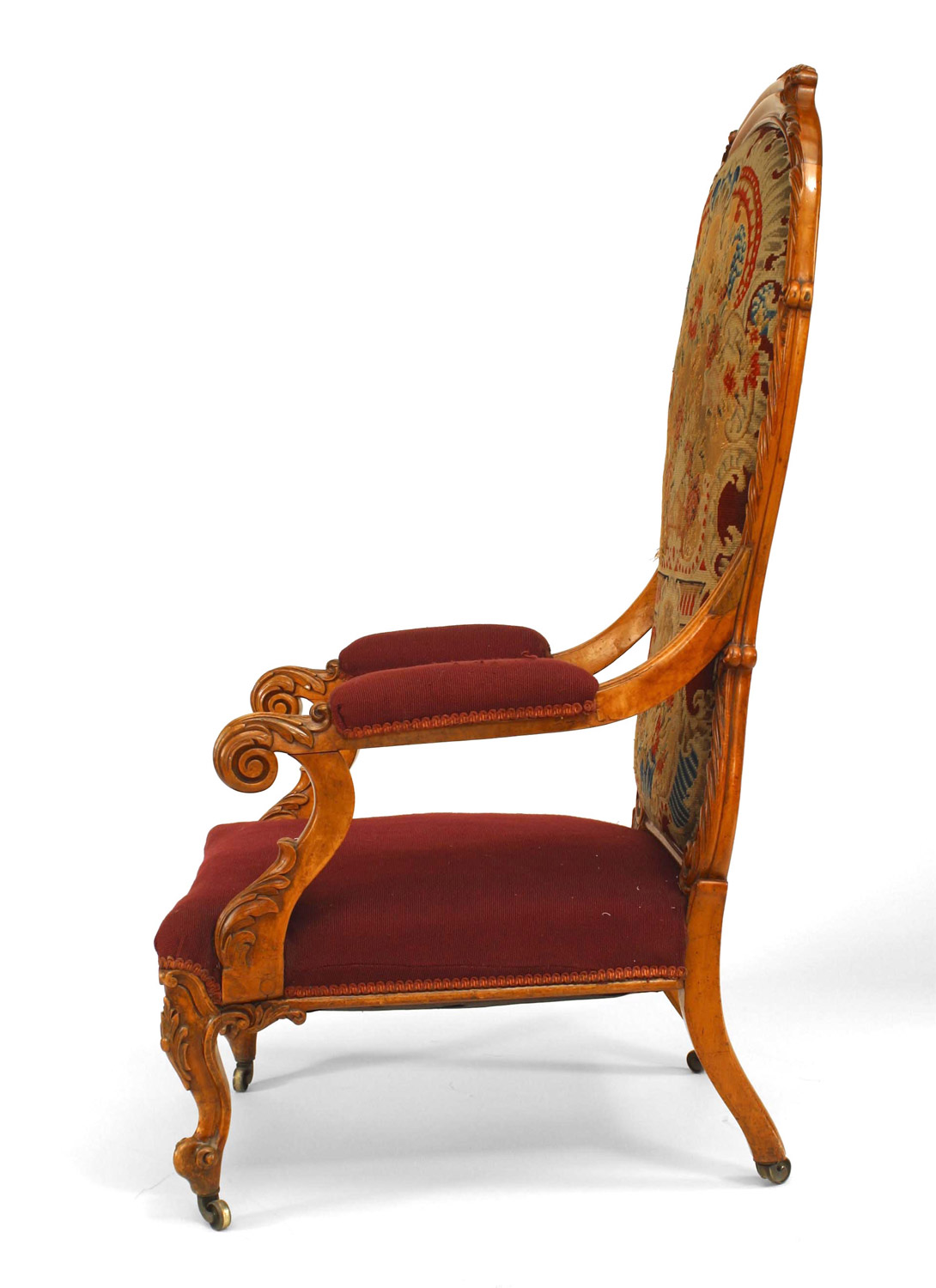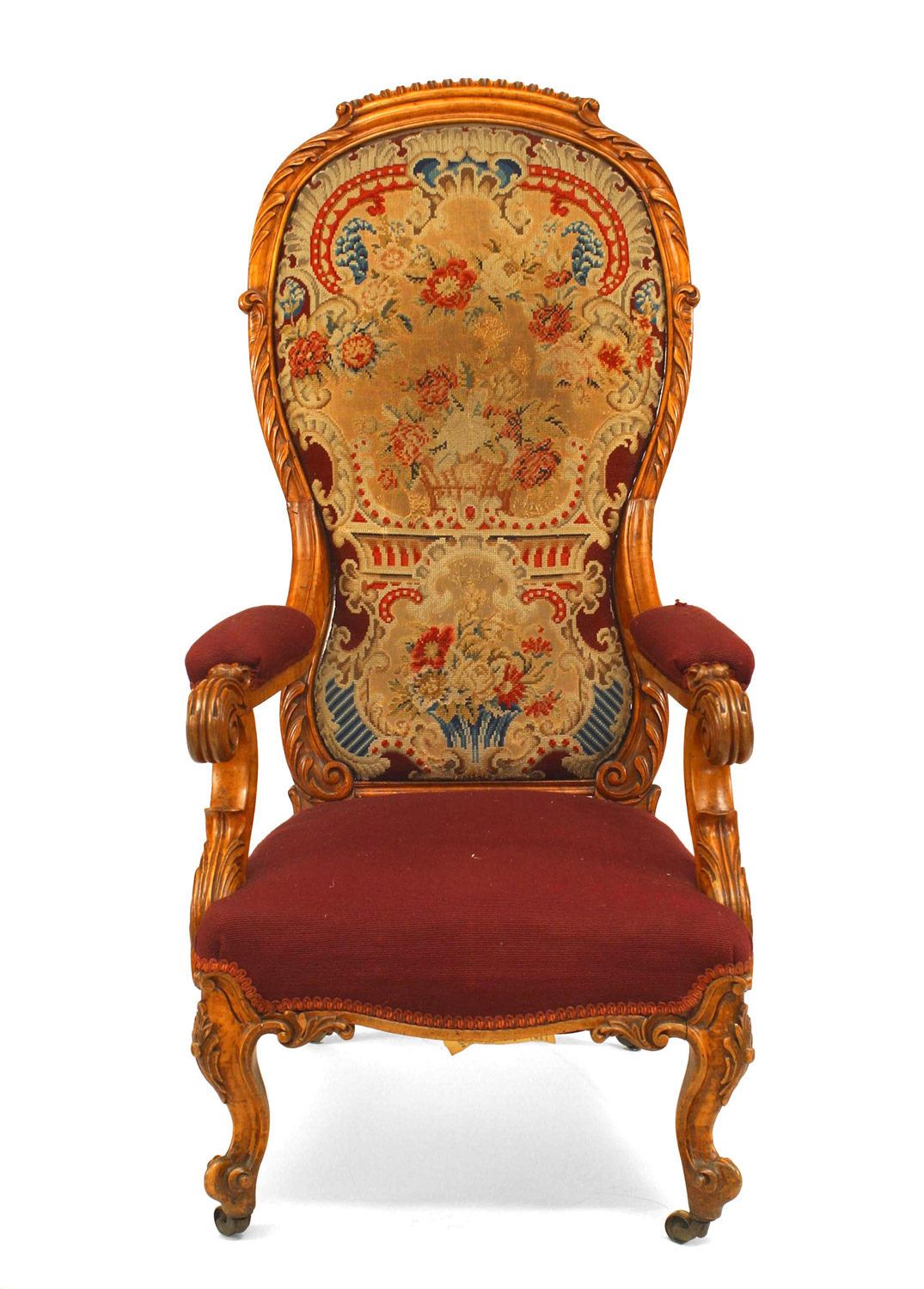 English Victorian carved satinwood high balloon shaped back arm chair with needlepoint upholstery..