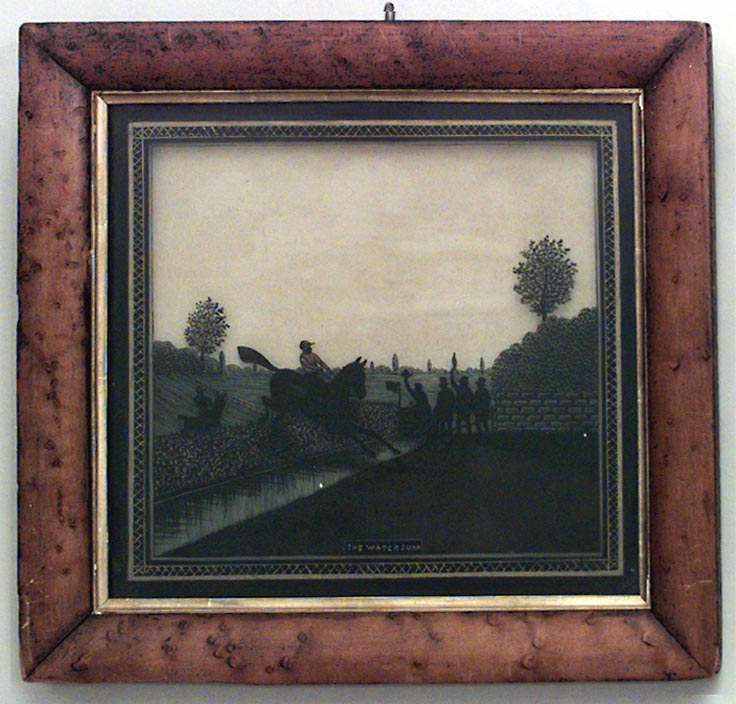 English Victorian maple framed silhouette on glass of a steeplechase scene titled: "The Water Jump".