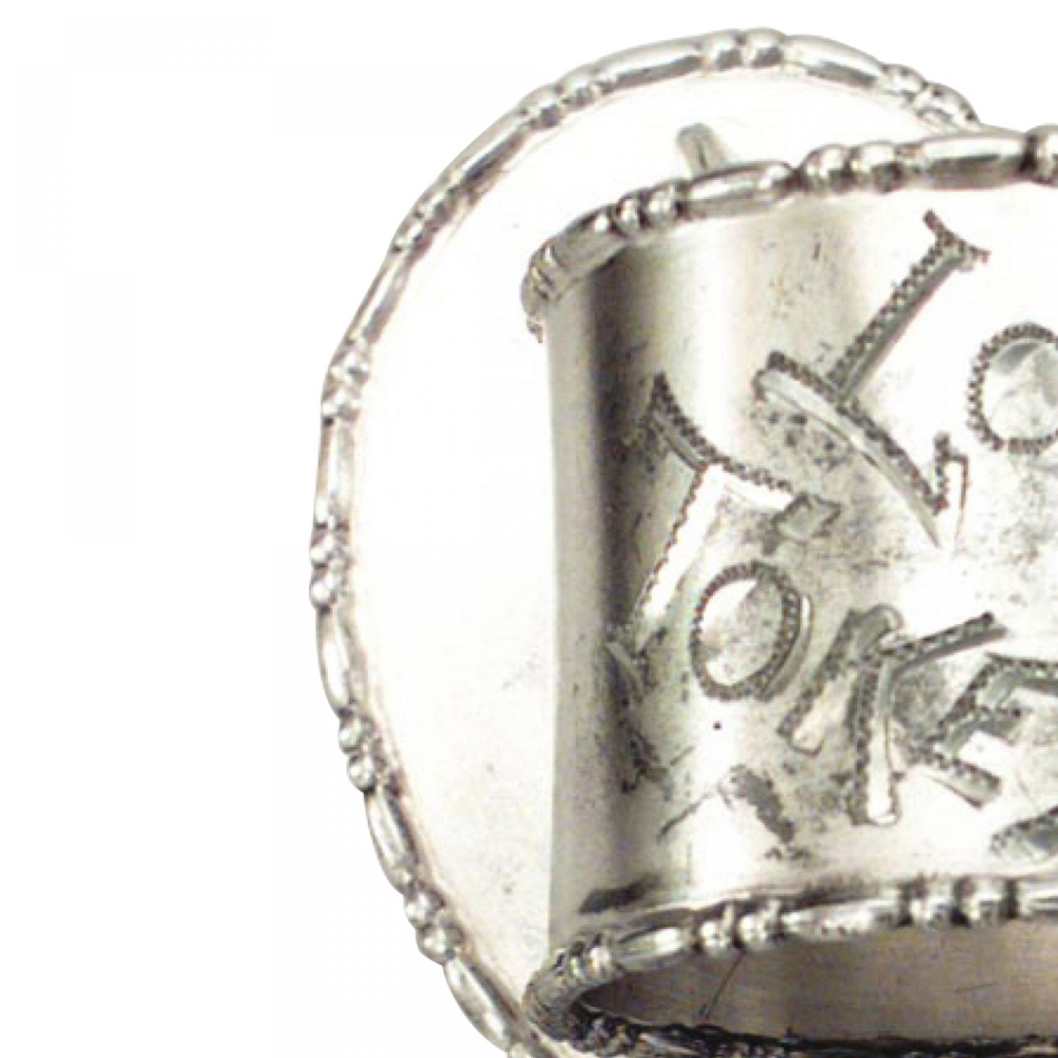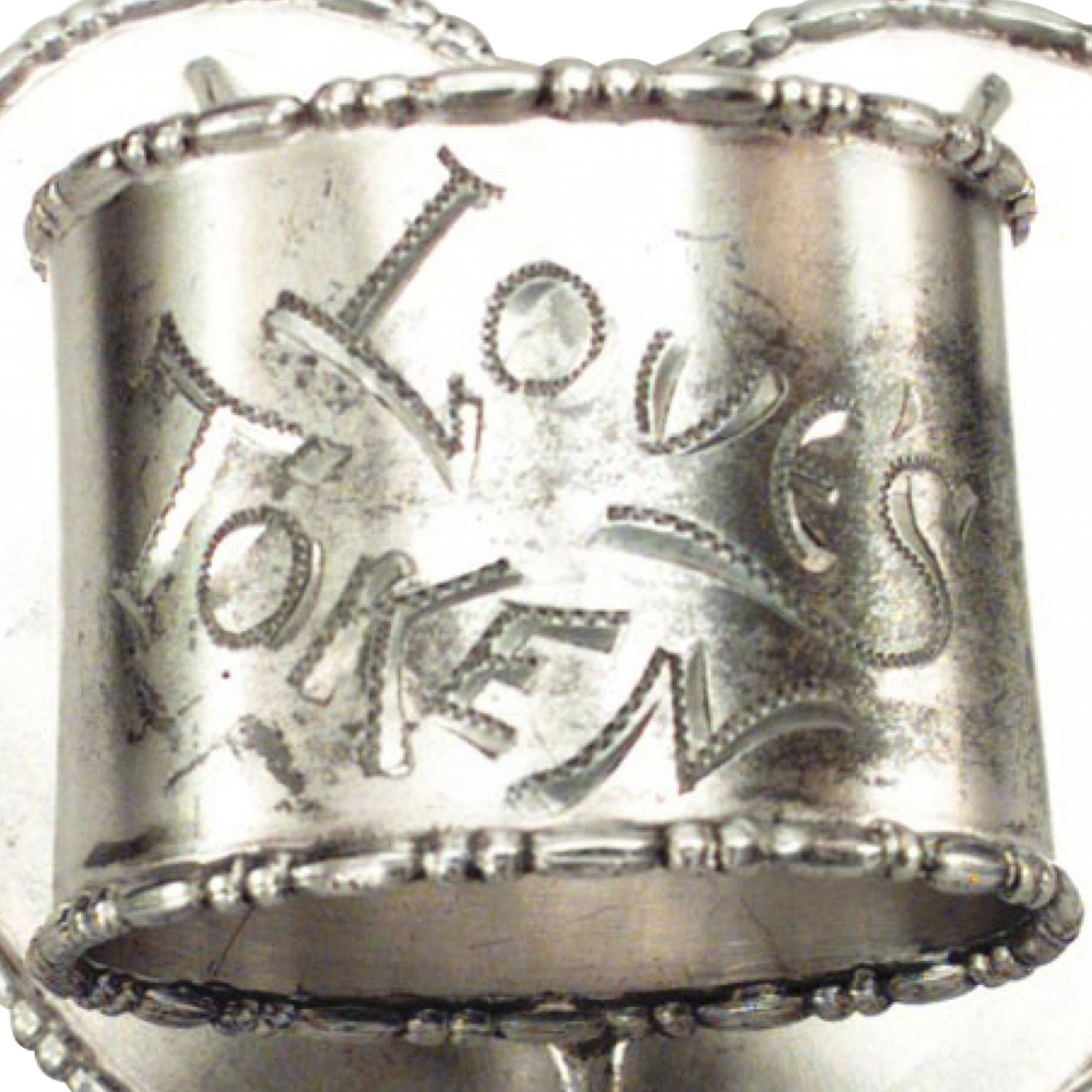English Victorian silver plate napkin ring with etched "Love Token" on heart shaped base.